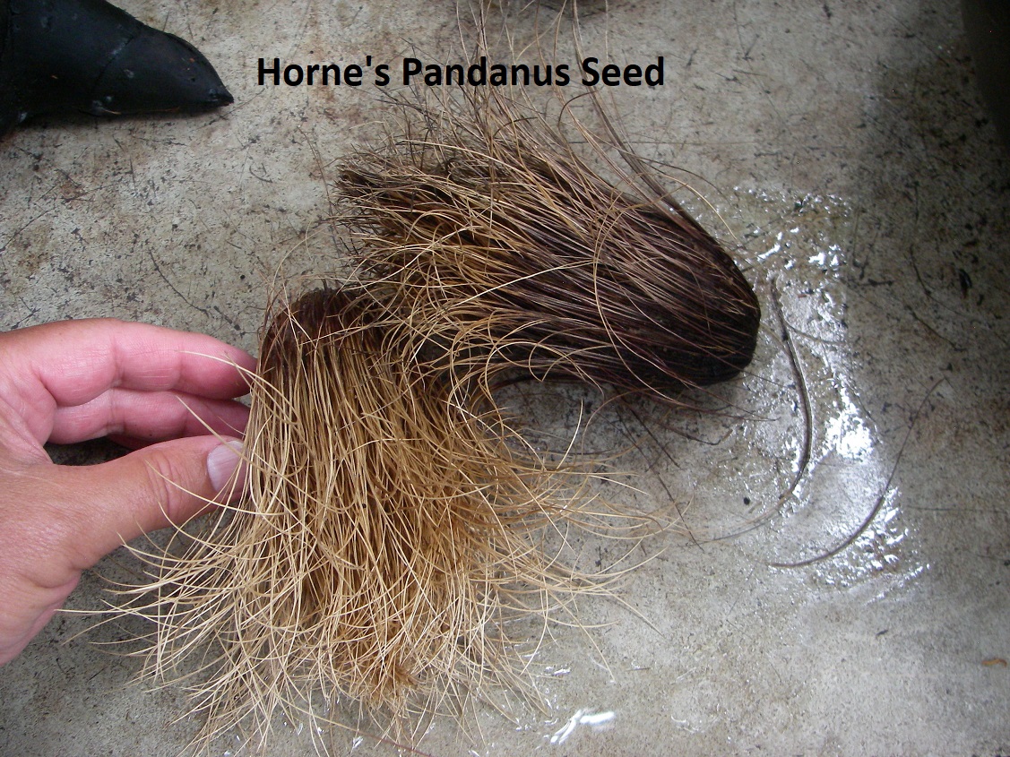 Pictured above, another native palm tree to the Seychelles is the Horne’s Pandanus (Martellidendron hornei), but this time the plant is claimed native to Madagascar as well, thus ‘only’ indigenous to Seychelles. However, this palm is a striking screwpine to 15m tall, with a smooth, but annual scarred main stem, being usually ongoing branched in 3’s and with the crown distinctive umbrella shaped. Stilt roots at the base of the trunk, and very long, dark green, leathery, linear and prickly leaves with red, marginal spines and spiny mid ribs. Male and female flowers on separate trees. The fruits are shaving brush structures on the forest floors around the palm and are easily recognizable, since the ‘hairs’ are normally very strait and not reflexed. (Popular with the fruit bats).