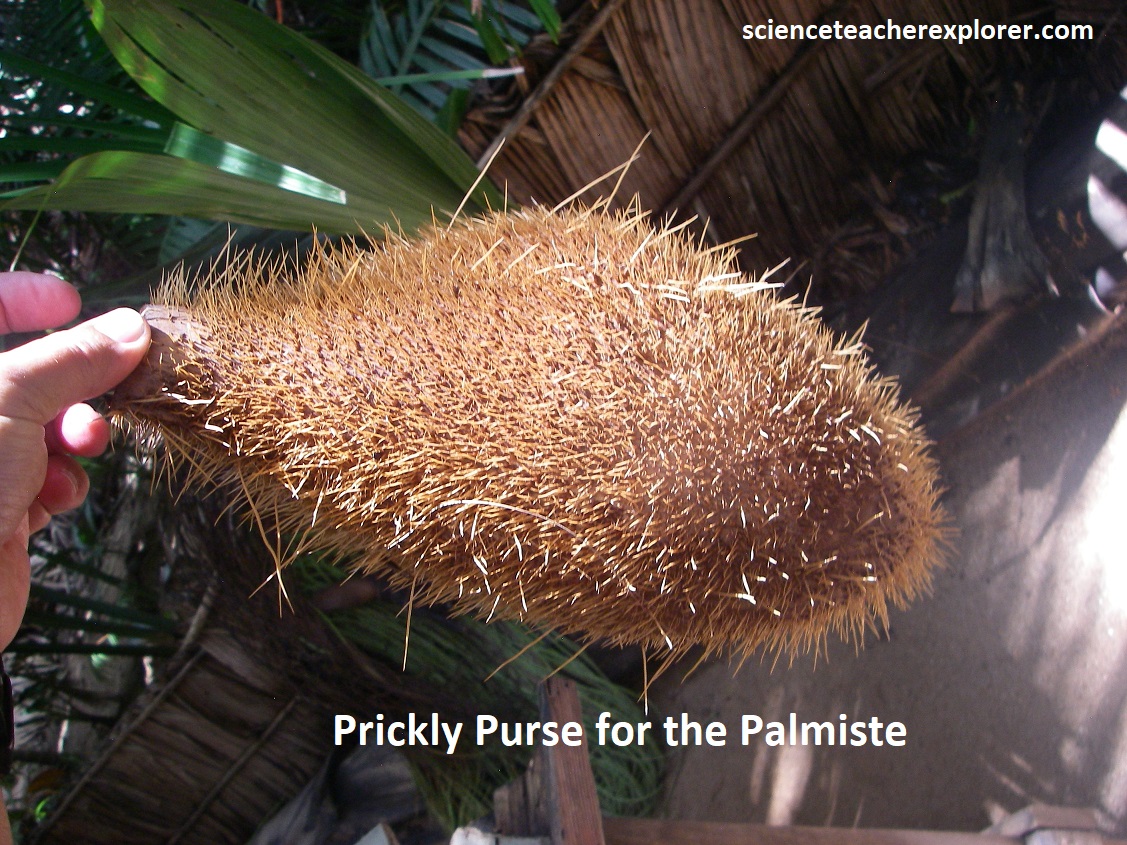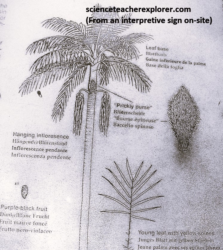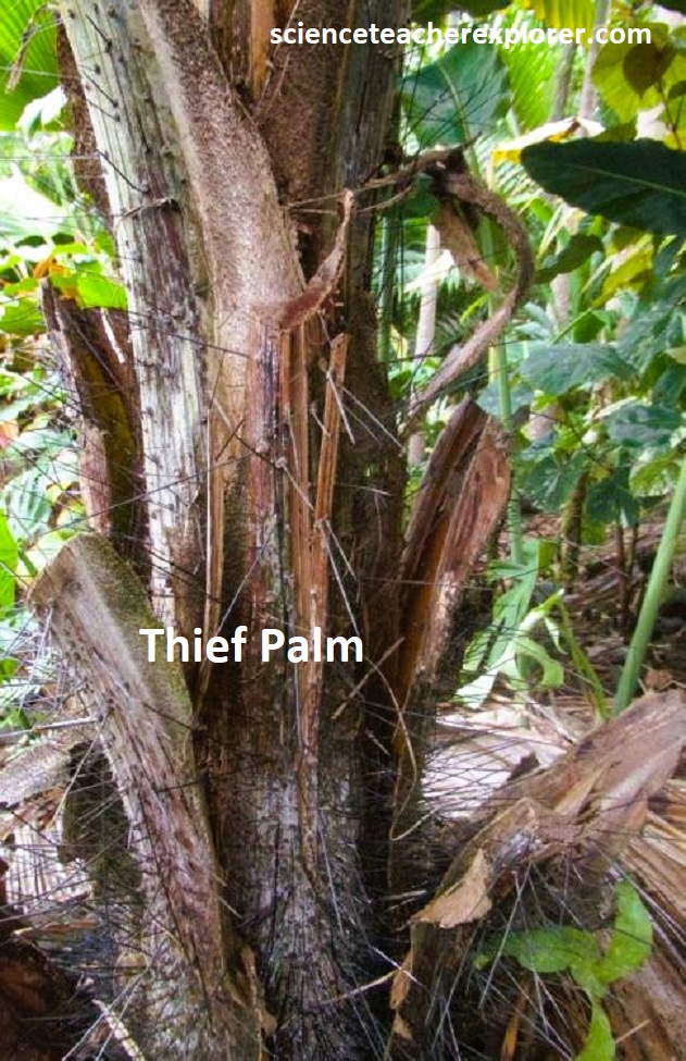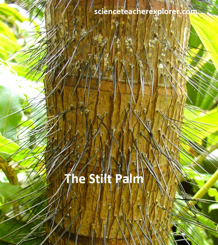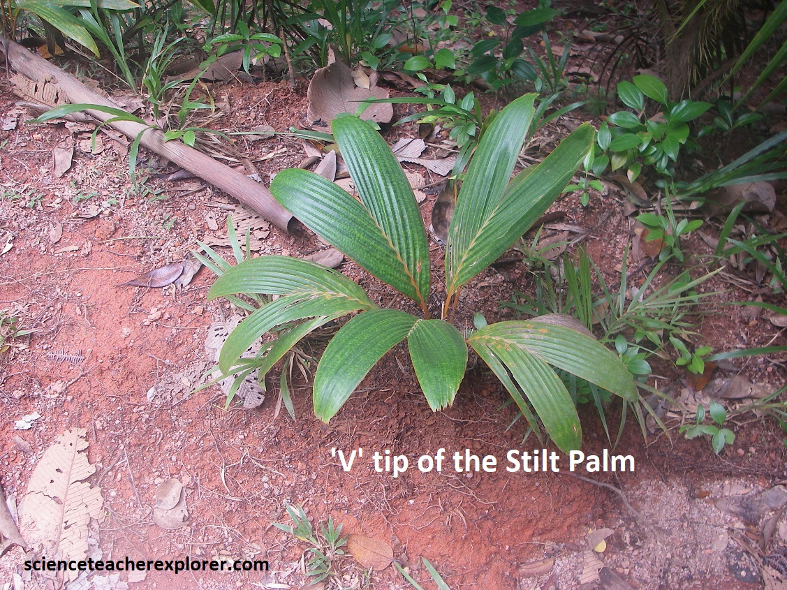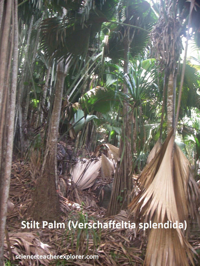 I. The Stilt Palm (Verschaffeltia splendida) is an erect and impressive to 30m tall palm with a cone of stilt roots at the base, (pictured above). The stilt roots are a stabilizing adaptation to steep slopes and potentially dynamic growth conditions. The leaves are large, entire or unbroken, to 3m, with an open ‘V” at the tip and regular toothed, (similar Thief Palm). The inflorescences to 2m long are slender, branched and more or less dropping, but now below the crown.