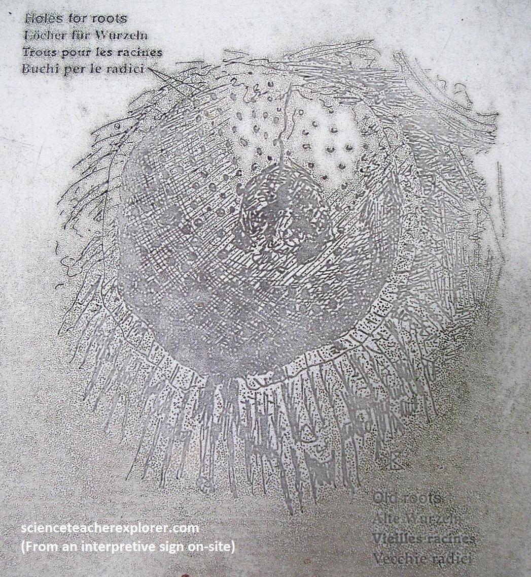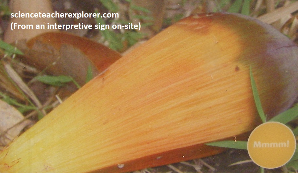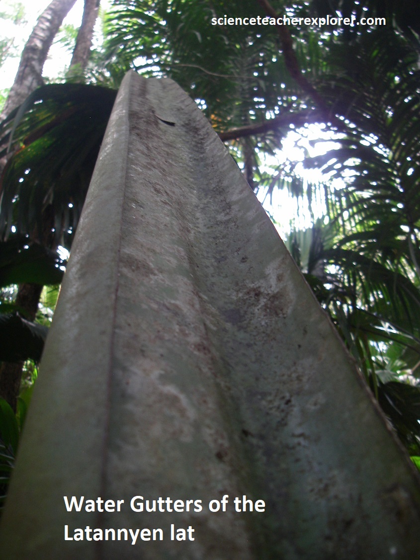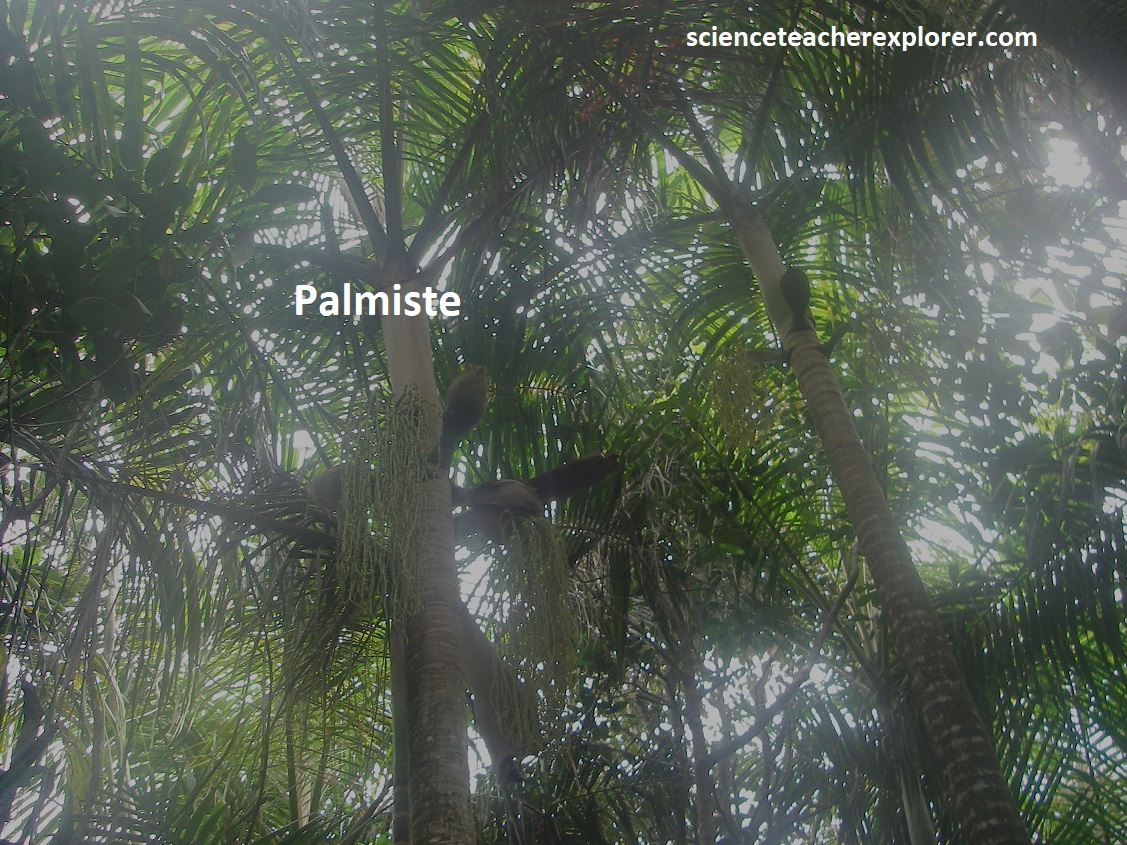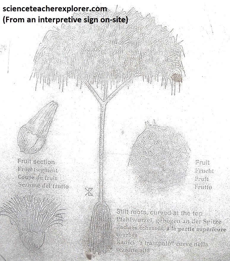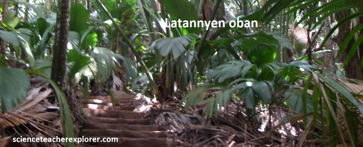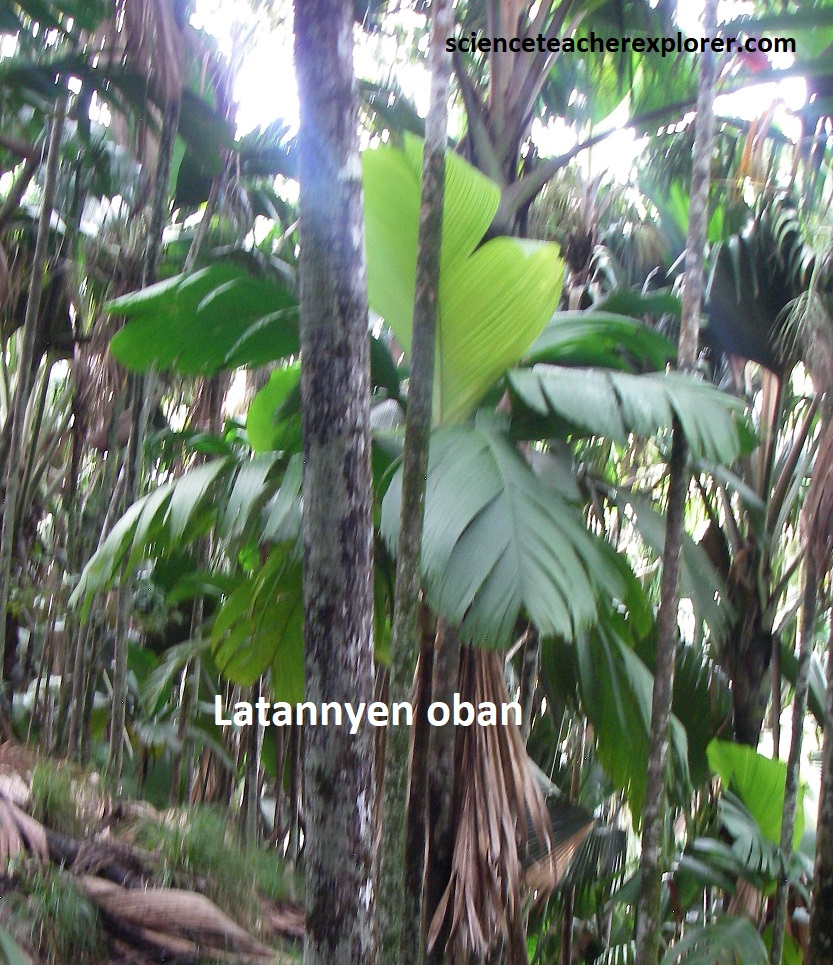 [Pictured above, the local Creole name ‘Latannyen oban’ derives from the French ‘latanier’ meaning once again ‘fan palm’ and ‘hauban’ meaning ‘rope’ or ‘wire’, i.e. ‘the fan palm (with) supporting wires’ referring to the supporting stilt roots.