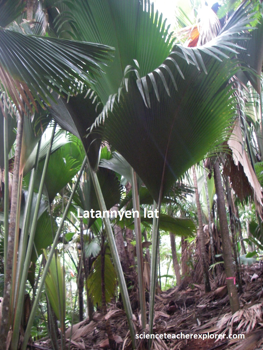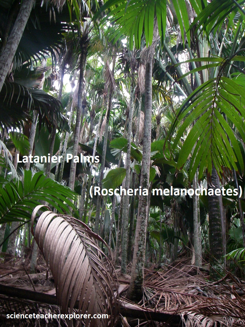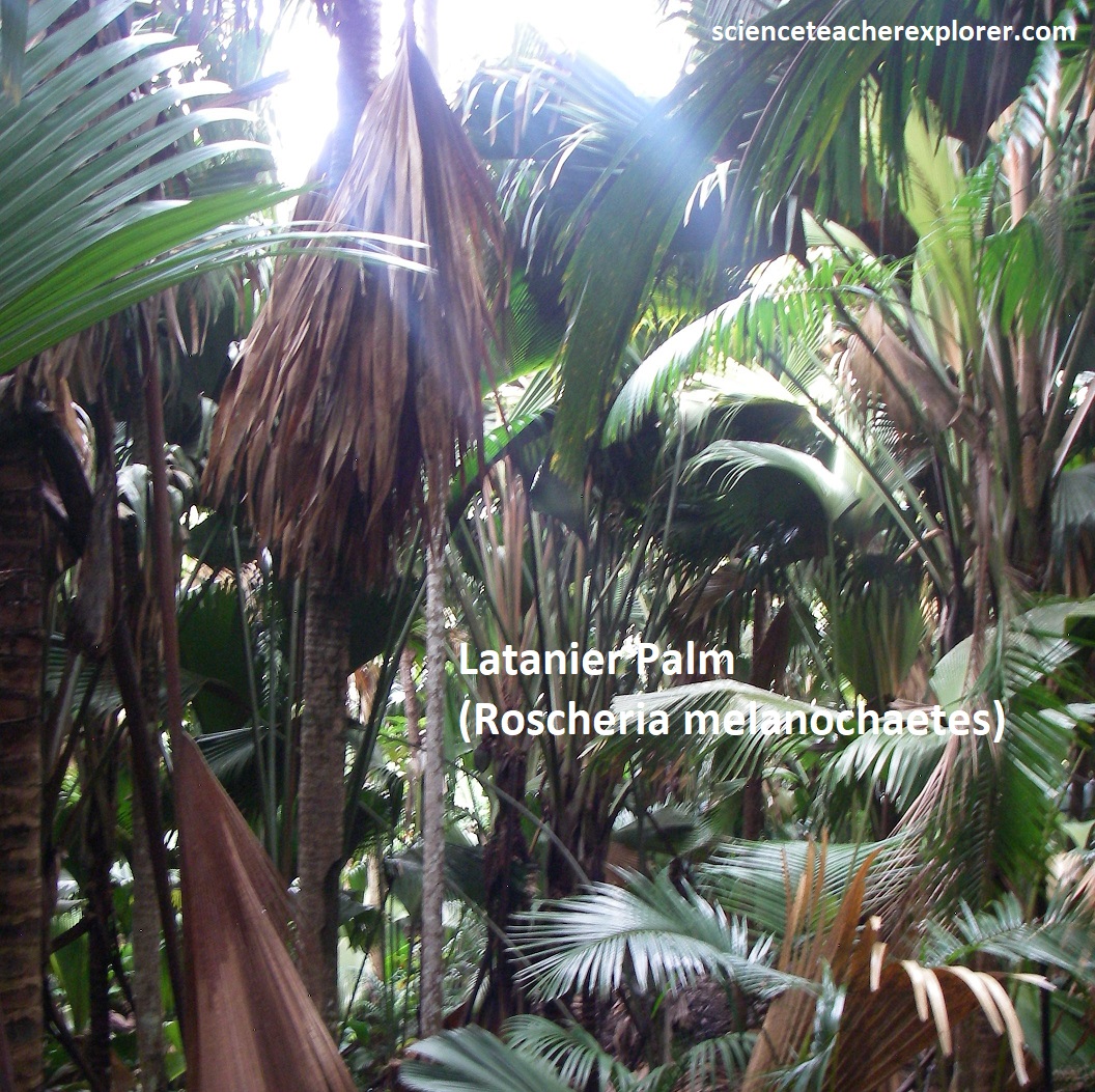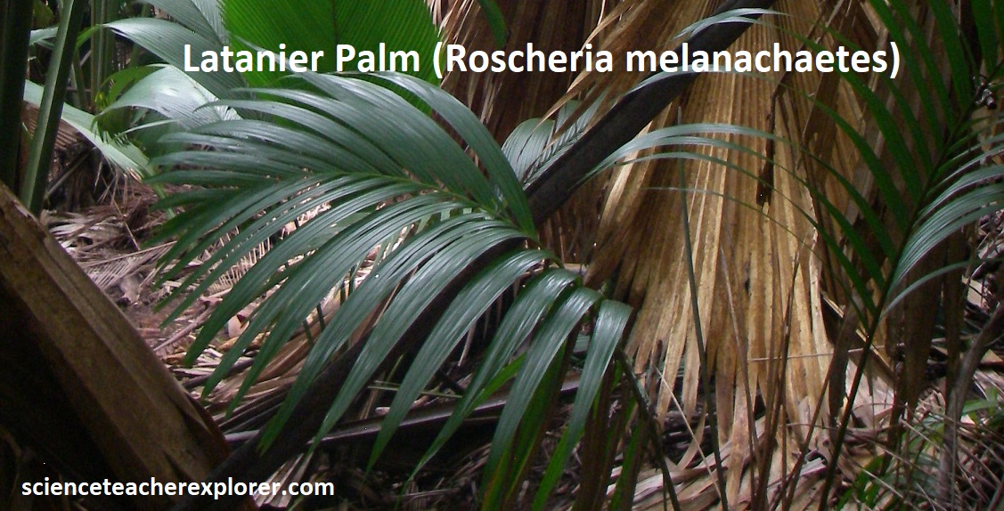 II. The Latanier Palm (Roscheria melanachaetes) is the smallest of the Seychelles’s endemic palms reaching only some 8m high, (pictured above). Small stilt roots. Large, pinnate leaves to 2.5m long, divided into irregular, broad and blunt tipped leaflets, Flowers tend to turn reddish along with underside of leaf. This palm is less common.