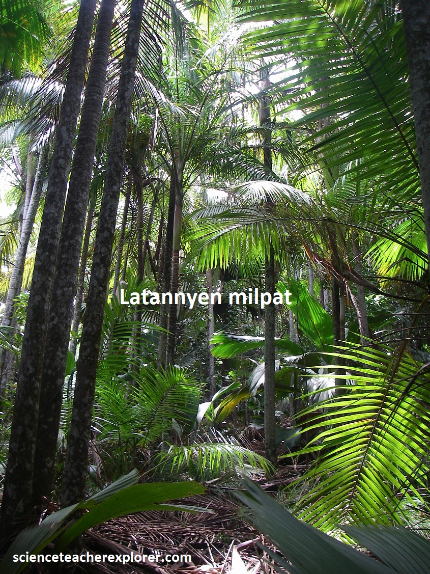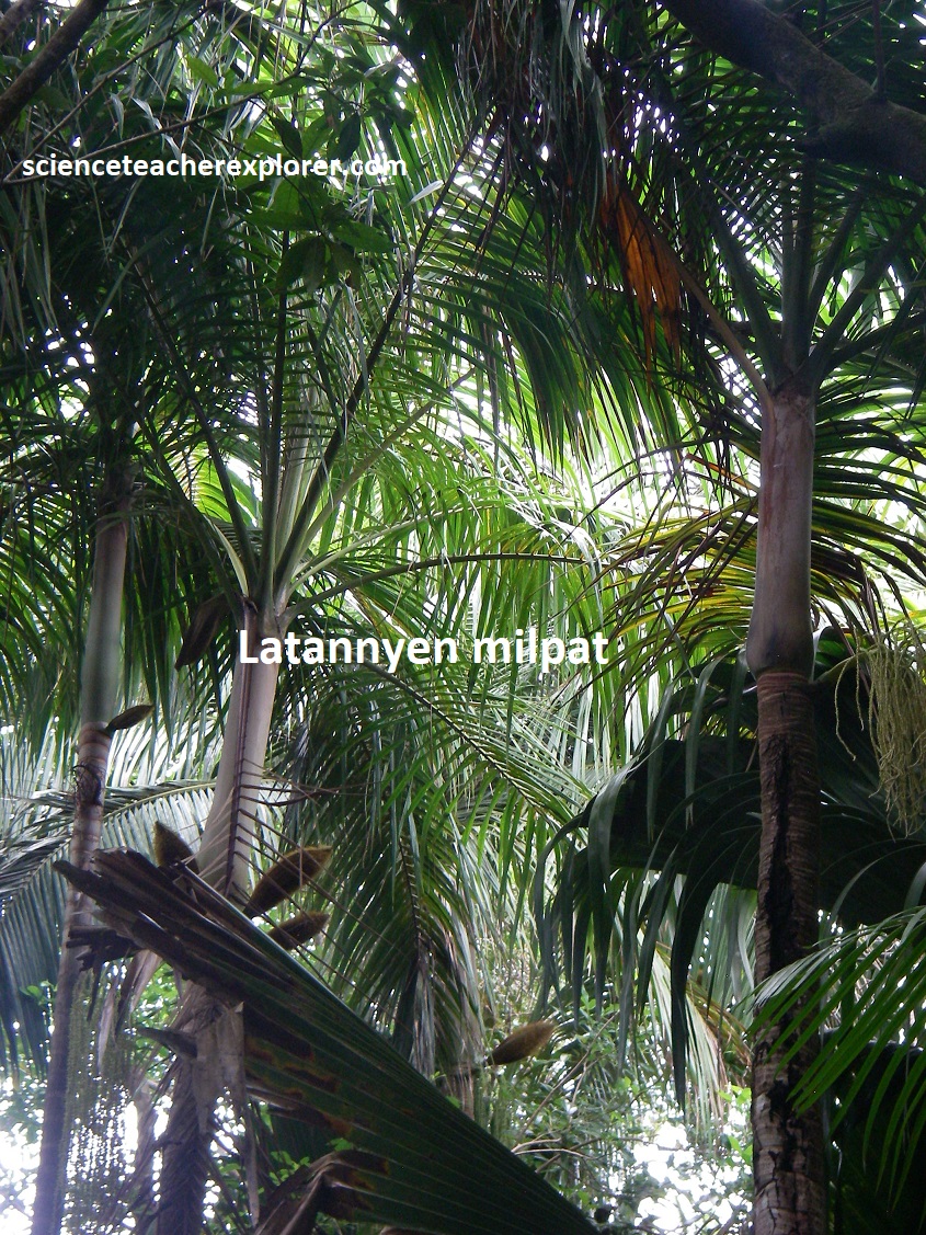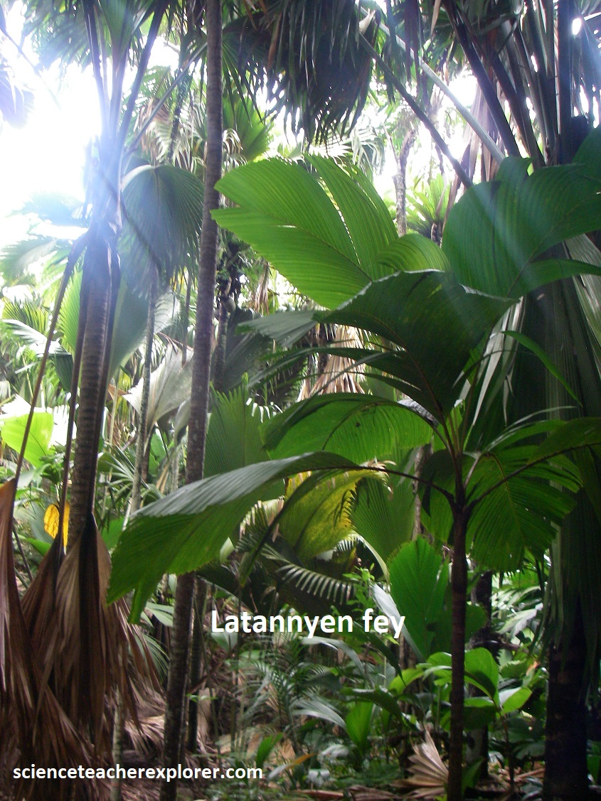 II. The Latanier Palm (Roscheria melanachaetes) is the smallest of the Seychelles’s endemic palms reaching only some 8m high, (pictured above). Small stilt roots. Large, pinnate leaves to 2.5m long, divided into irregular, broad and blunt tipped leaflets, Flowers tend to turn reddish along with underside of leaf. This palm is less common.