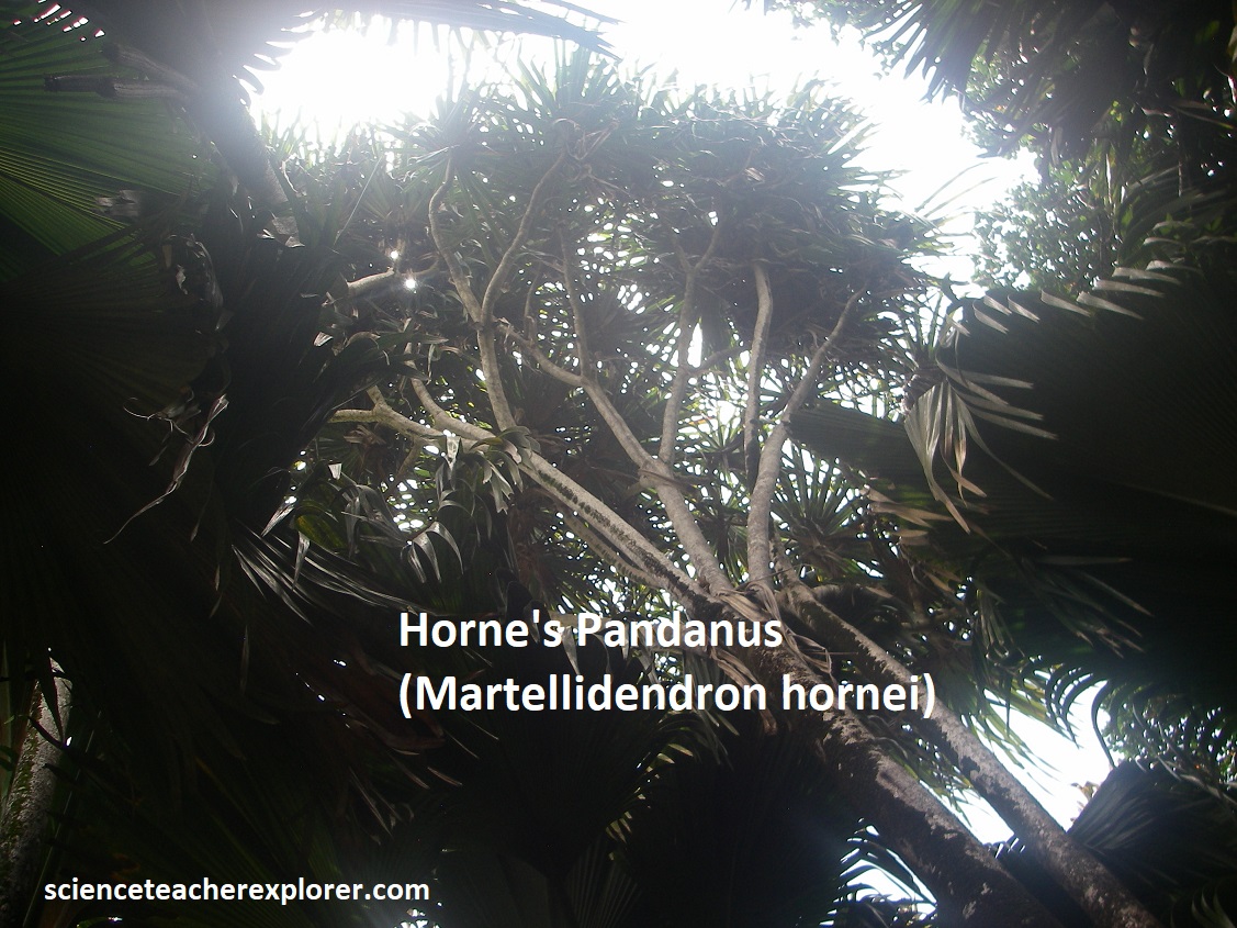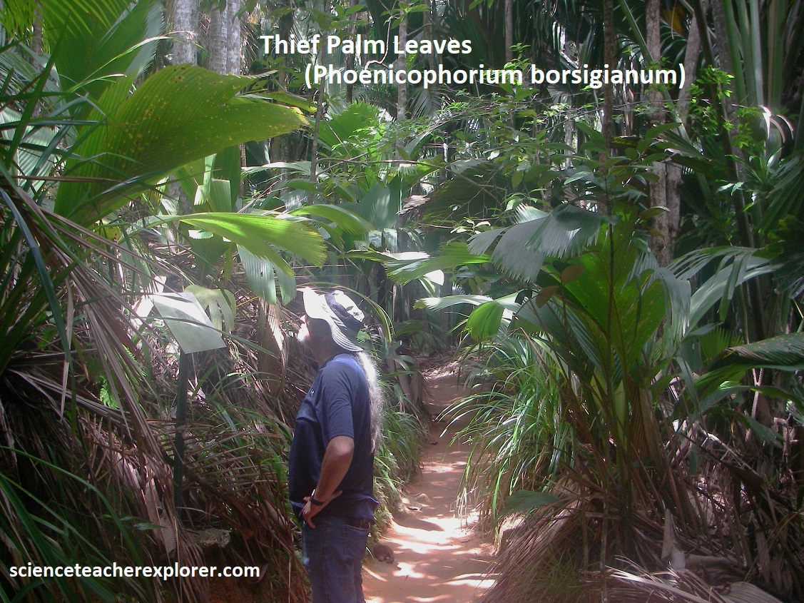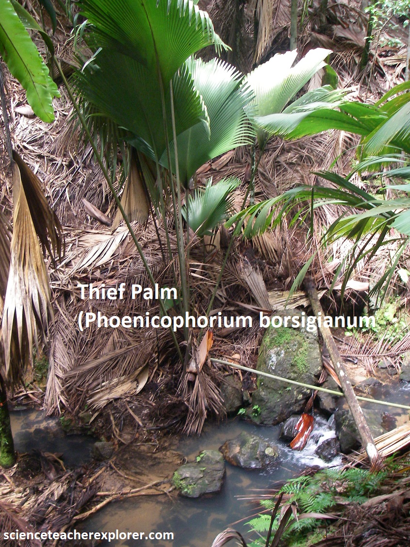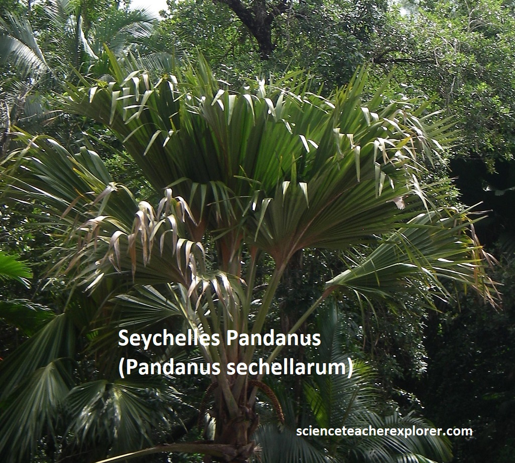 An additional palm-like plant found in the Vallee de Mai is the Seychelles Pandanus (Pandanus sechellarum). Actually this is not a genuine palm but a screwpine that is 15m tall with many, vert long, stout, widely spaced and downward growing stilt roots to 10m emerging from the main stem. Very long, narrow to linear, leathery, prickly and light green leaves to 1.5m long with whitish spines on the margins and mid ribs. Male and female flowers on separate trees,