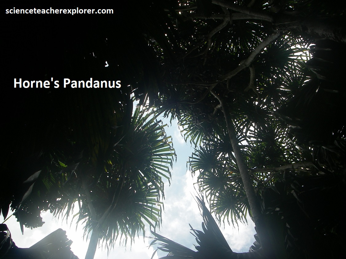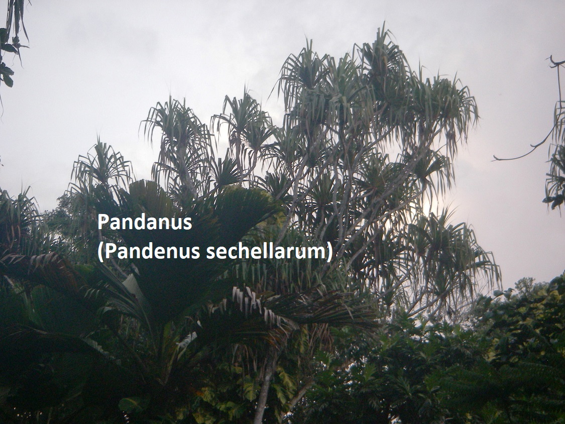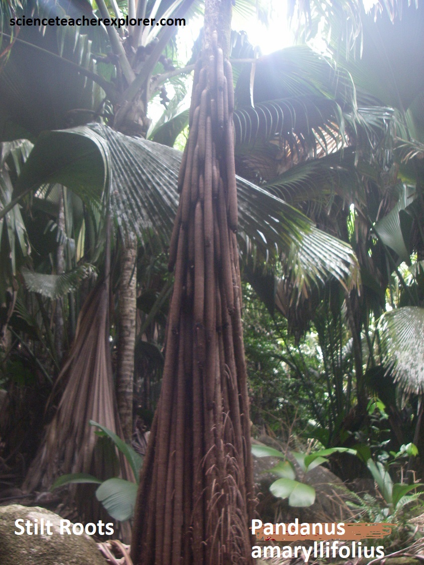 An additional palm-like plant found in the Vallee de Mai is the Seychelles Pandanus (Pandanus sechellarum). Actually this is not a genuine palm but a screwpine that is 15m tall with many, vert long, stout, widely spaced and downward growing stilt roots to 10m emerging from the main stem. Very long, narrow to linear, leathery, prickly and light green leaves to 1.5m long with whitish spines on the margins and mid ribs. Male and female flowers on separate trees,
