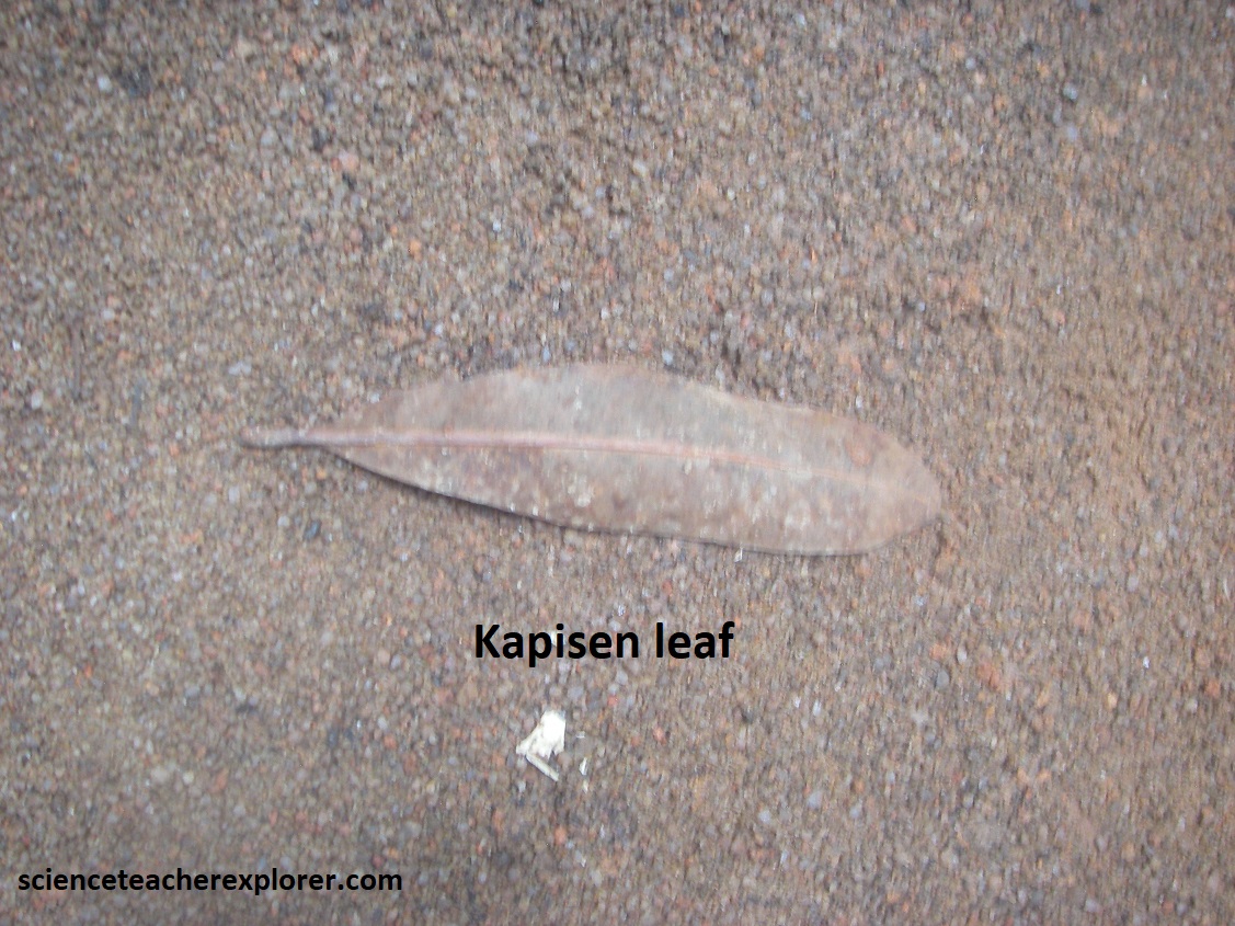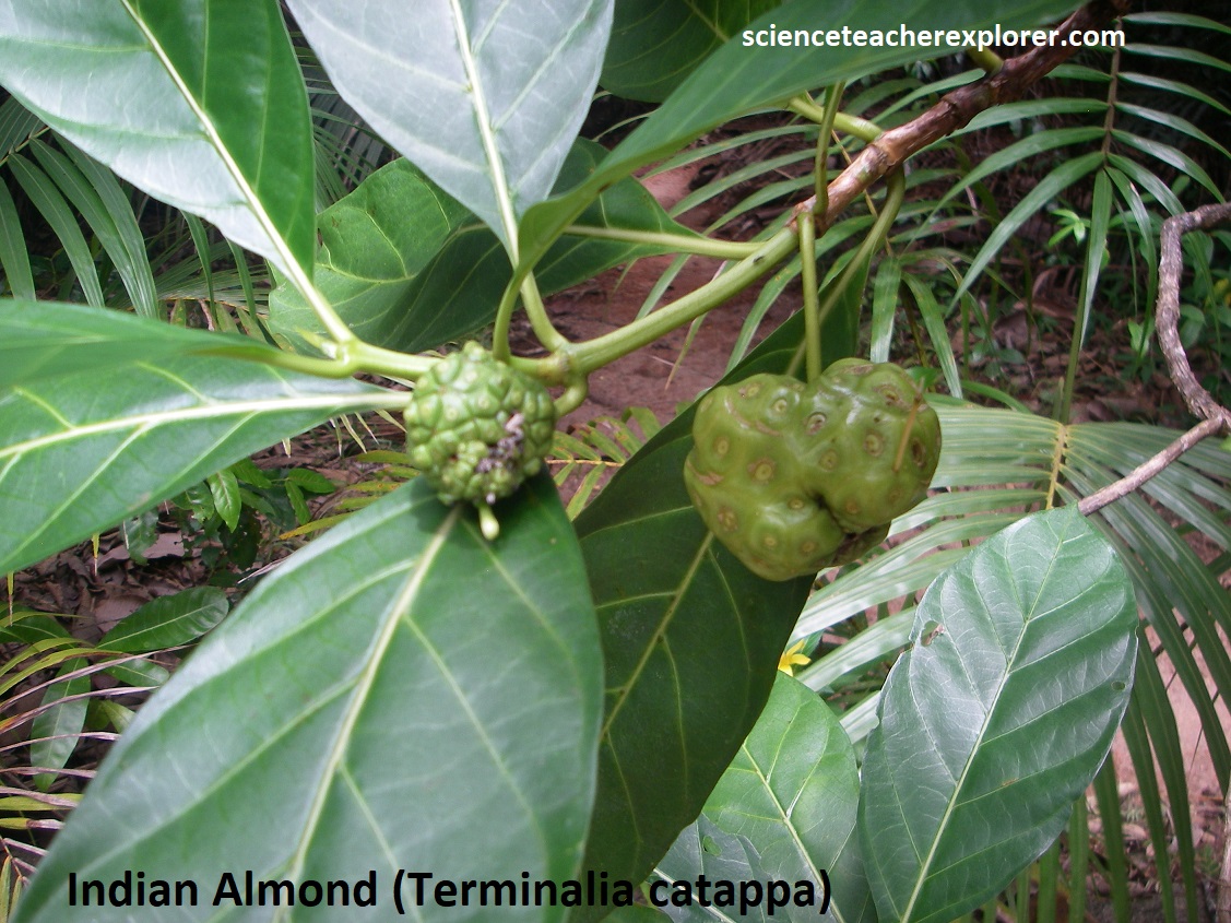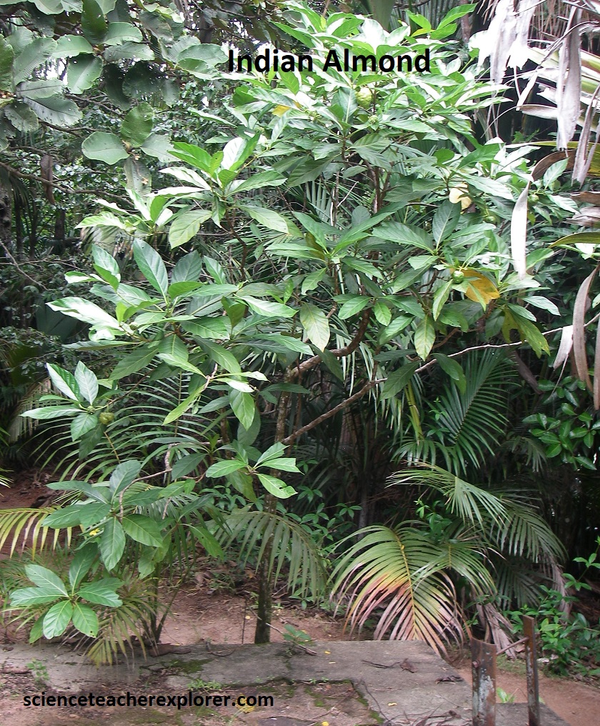 Pictured above, the Indian Almond (Terminalia catappa) is a very common, large, spreading, 20m tree with an upright, symmetrical but horizontally levelled crown due to the young branches emerging horizontally from the straight central trunk. Large, obovate, glossy, dark green and leathery leaves in bunches at the ends of the branches. The wood is red, solid and has a high water resistance. Thus, it can be used for canoe making. The fruits hava a distinctive sweetish almond-smell, which are edible. A tea from the leaves is said to be useful against pimples, fungal skin ailments, hypertension, diabetes, dysentery and diarrhoea.