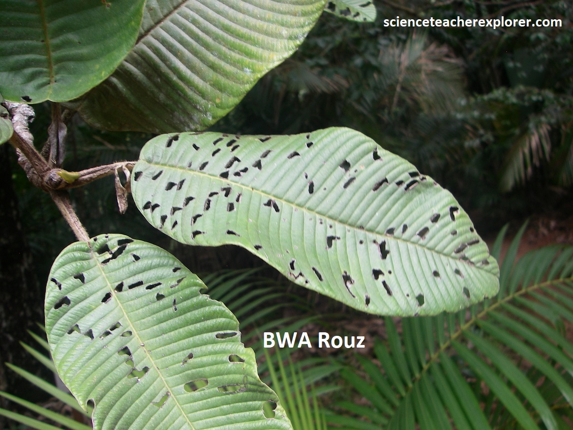 Pictured above is the Bois Rouge (Dillenia ferruginea). It is an endemic Tree that is found only in the hills of the Seychelles. It is a shrub or tree that can grow up to 15 meters tall. The leaves of the Bois Rouge plant are heterophyllous, meaning that the young leaves look different from the adult leaves. The young leaves are red in color. The Bois Rouge plant produces small fruits that resemble drupes. The fruits turn dark blue to black when they are ripe. The Bois Rouge plant is often seen with many holes in its leaves.