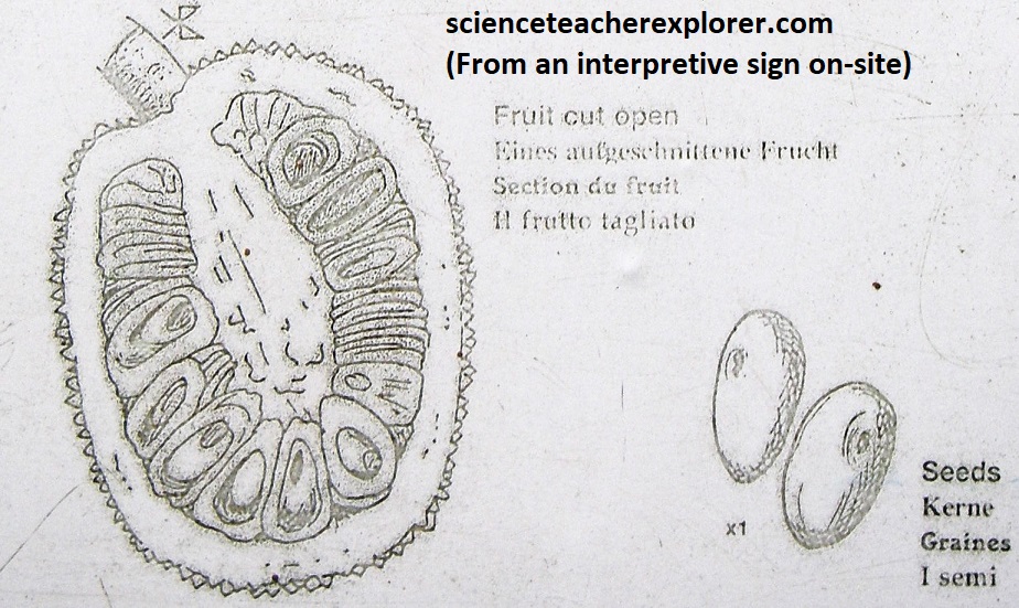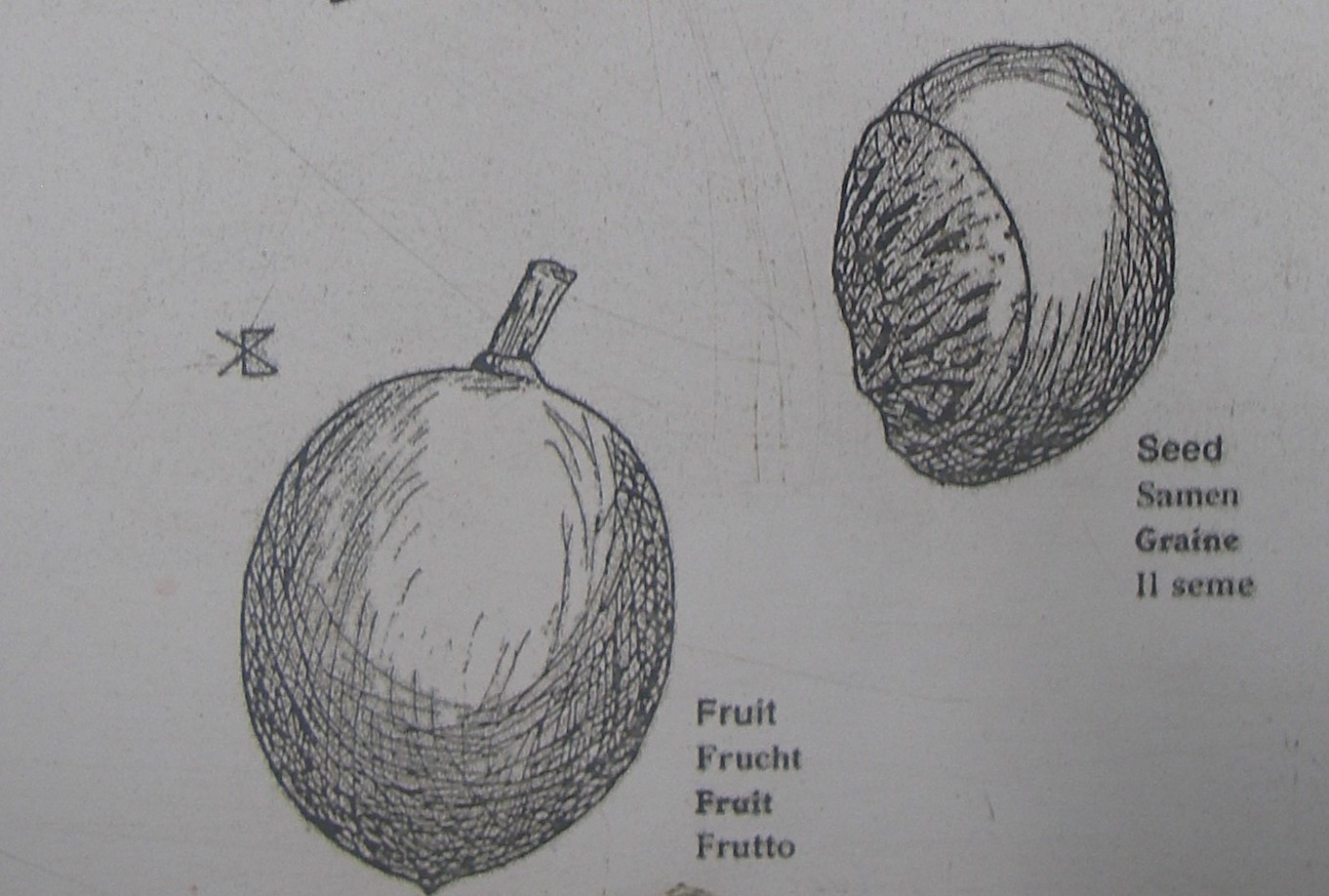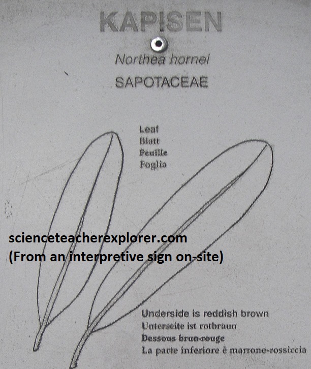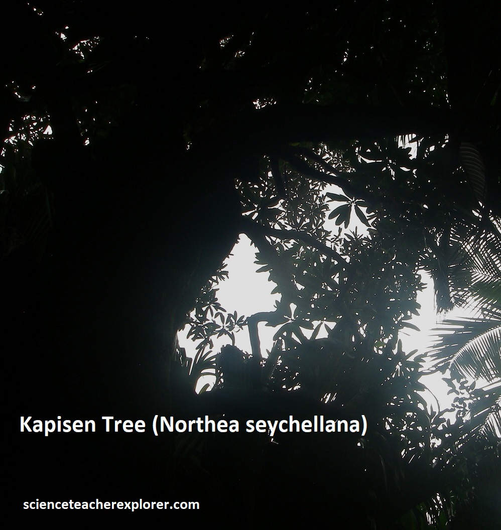 Apart from palms and screwpines, there are other endemics growing in the Vallee de Mai. Picture above, the Kapisen Tree or Northea (Northea seychellana) is common in the mountains above 600m, (pictured above). However in the lower hills, including Vallee de Mai, only scattered trees remain because the time is high valued and almost all tall trees have been cut. An intrepid Victorian artist, Marianne North, painted Kapisen trees and sent specimens back to England for identification. The tree was named Northea after her. The Creole name, capucin, is derived from the form of the large seed, which bears a resemblance to the head of a cowled Capuchin monk. Other distinctive features are the dark reddish brown bark and the reddish brown underside of the mature leaves. The flowers are inconspicuous. Fruit bats eat the outer fleshy part of the fruit. The stout Northea tree, which come to 20m tall, has a thick, stumpy and gnarled twigs and white latex.