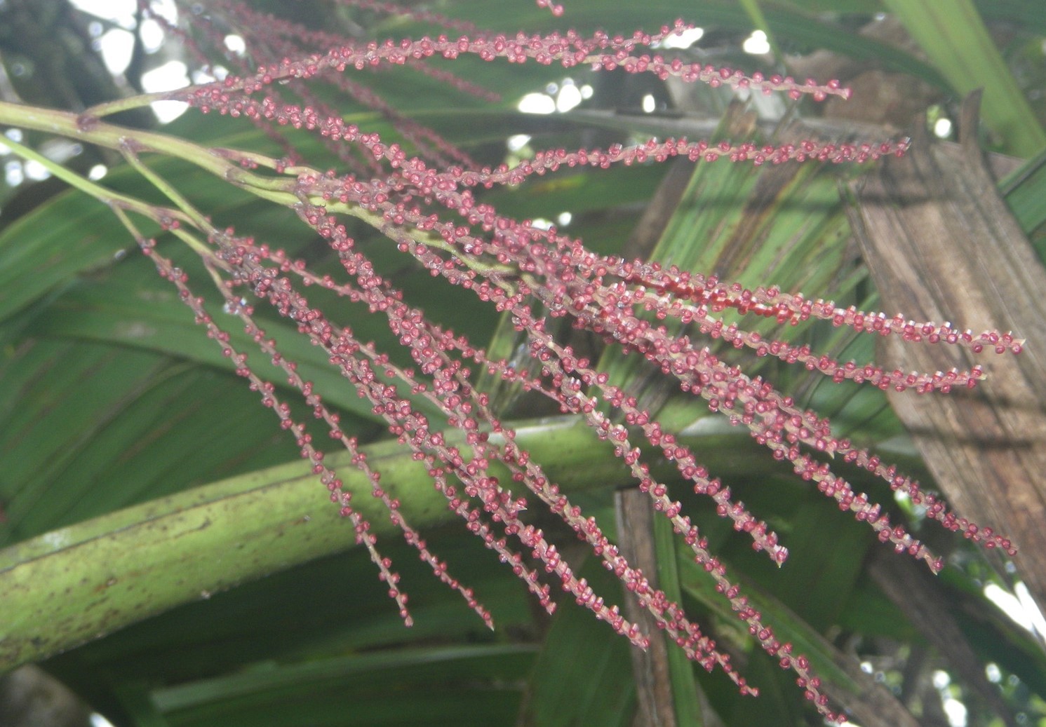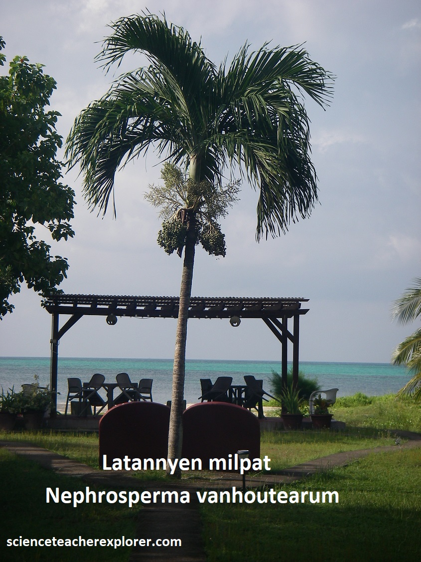 IV. The Latannyen milpat (Nephrosperma vanhoutearum) is an erect, slender, unbranched and to 14m tall palm, (sometimes with small stilt roots). Pictured above, the leaves are very large, lax and pinnate being divided into some 40 long and narrow pairs of leaflets. The inflorescences are very long, to 2.5m, upright, stiff, open branched and mingled among the crown leaves. The individual flowers are yellow but tiny if not almost inconspicuous and in cluster of three (one female and two male flowers).