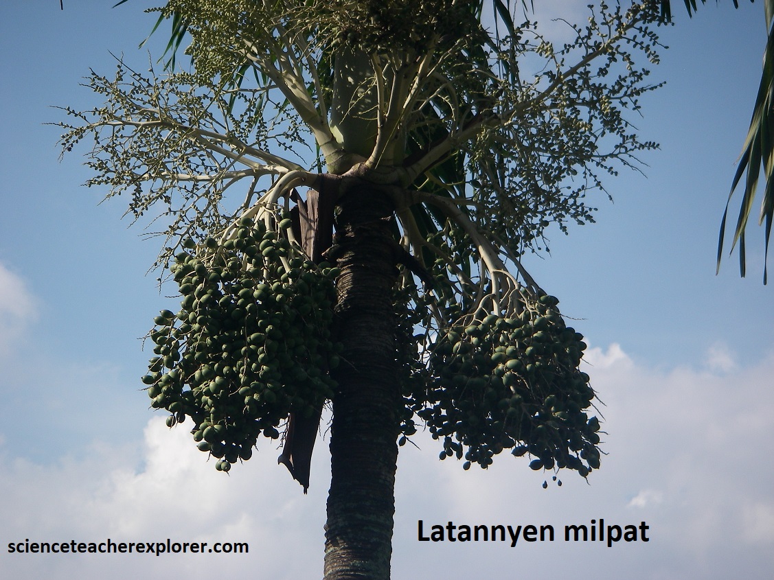 [Pictured above, the Creole name ‘Latannyen lat’ derives from the French ‘latanier’ meaning ‘fan palm’ and ‘latte’ meaning’laths’ thus referring to the fact, that the trunk in the past has served well to produce very much esteemed laths, i.e. long narrow strips for amongst others water gutters.]