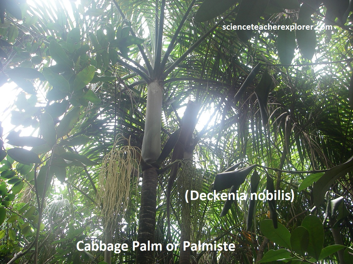 III. The Cabbage Palm or Palmiste (Deckenia nobilis) is a stout, statuesque and tall palm to impressive 40m with a slender, unbranched trunk full of conspicuous leaf scars, (pictured above). Yellow spines at the stem bases of seedings and young plants. Very large, pinnate leaves to 5m long being feathery divided into 60 or more pairs of equally long, narrow and pointed leaflets. Long, green, cylindrical and stem base. Drooping inflorescences of tiny but creamy flowers emerging from a prickly spathe, sheath or protecting ‘purse’ held at right angles to the trunk and hereafter drooping. The palm hearts are edible and sought after. Very common in Praslin.