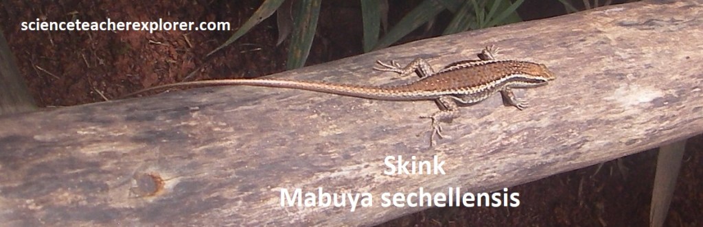 Pictured above, the Seychelles Skink (Mabuya sechellensis) was seen clambering along the fallen trees of the forest for of the Vallee de Mai. It is one of 3 endemic skinks in the Valle de Mai. This fairly small and slim skink had a very distinct black stripe along its side. It feeds on fallen eggs and chicks, insects, fruits and food scraps.