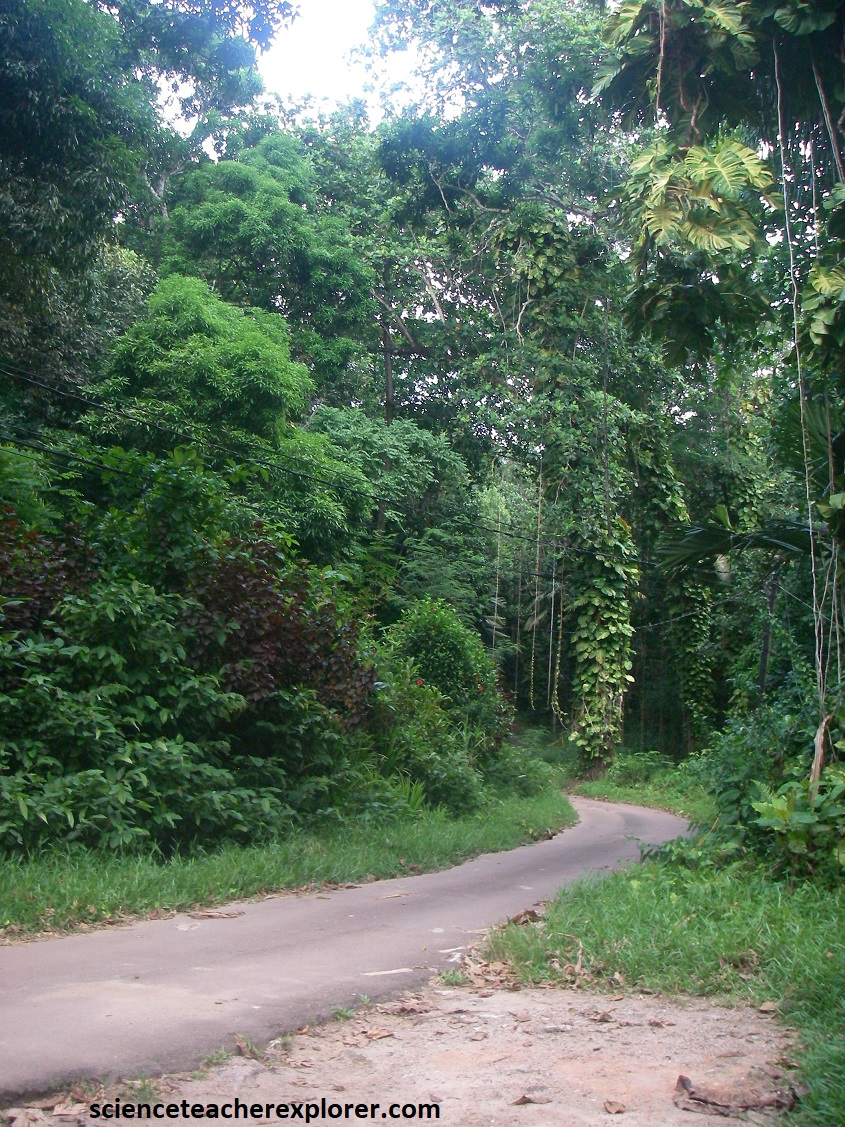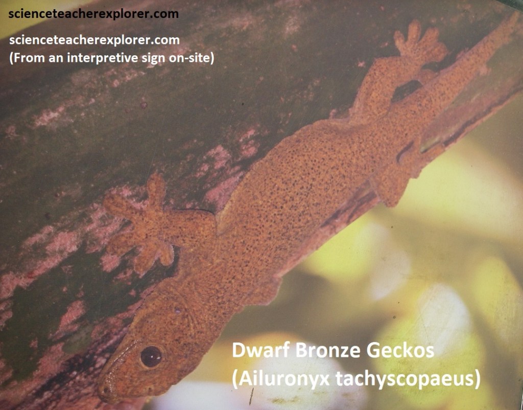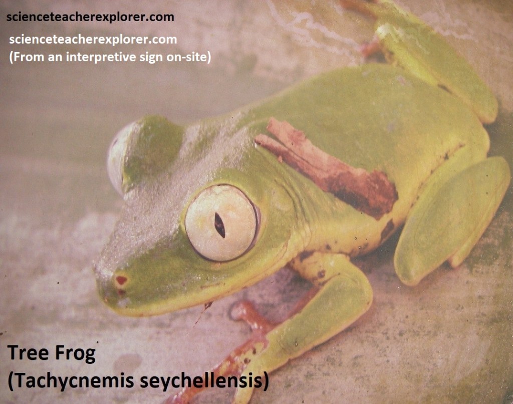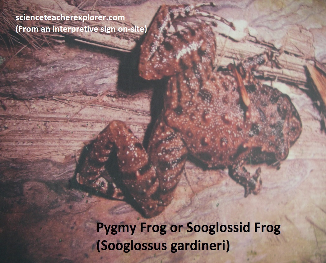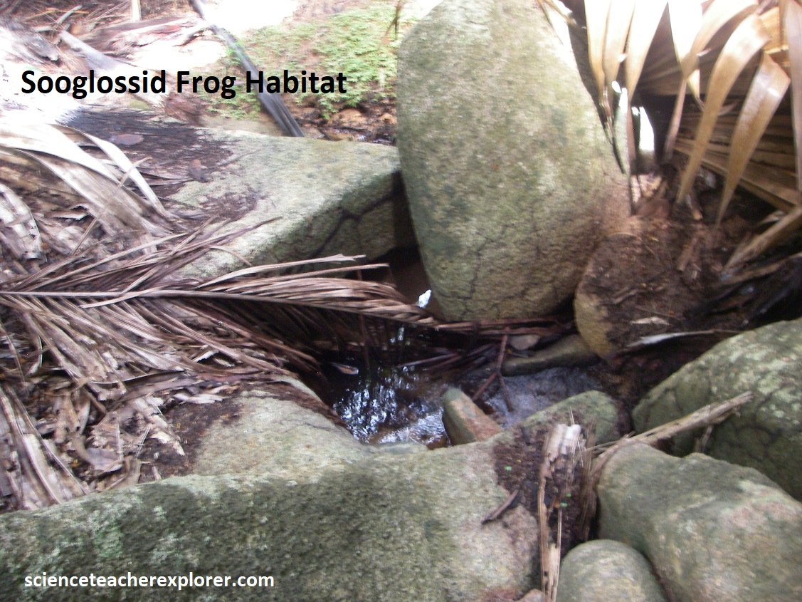 Pictured above is the habitat and the tiny endemic Seychelles Pygmy or Sooglossid Frog. It is 1.2 cm long and is to be found in a tiny stream at the Vallee de Mai, Due to its tiny size, we were able to hear it and not see it. It’s high-pitched peep resembles an insect call and could be heard during the day as we walked by.