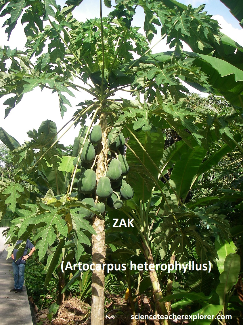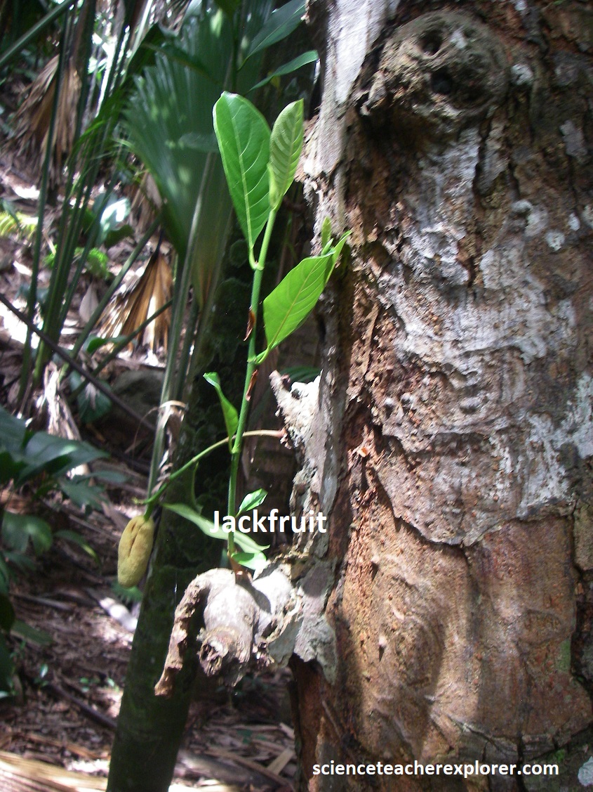 Other than native plants the Vallee de Mai host some quite remarkable ones of which is the Jackfruit (Artocarpus heterophyllus). Pictured above, originally from South East Asia, this introduced tree is conspicuous because of the very large fruits, (36kg), which grow directly from the trunk and the larger branches. It is related to the breadfruit tree, also introduced. The fruit has a strong smell when ripe. The sweet yellow inner flesh surrounding each seed is removed from the sticky outer flesh and eaten raw. The seeds are eaten, either roasted or curried, immature fruit can also be cooked as a curry. Seeds often start to germinate before the fallen fruit has rotted and seedlings are numerous. Jack fruit has become naturalized in the forests of Seychelles and the timber is sometimes used for furniture and doors.