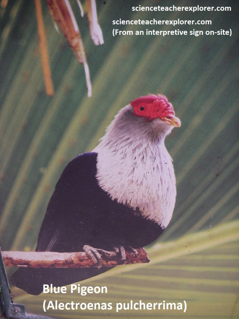 Pictured above, found only in the Seychelles, the Seychelles Blue Pigeon (Alectroenas pulcherrima) is most commonly seen on the Praslin Island. Mike and I had no luck in finding it in the Vallee de Mai, but were told they were commonly seen in the morning near the entrance. I was also told that its easy to spot perched on the power lines along the coast road on the wet side. However, the bird proclaims its territory by a low pitched and percussive song ‘kok ko ko ko ko ko’ as well as by long ascending flights followed by glides and wings bend downwards. Since we spent most of our time in the Vallee de Mai, we didn’t witness this.