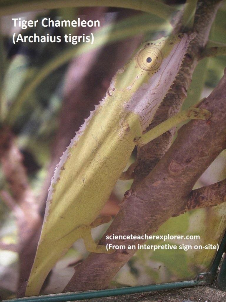 Still on all fours but now really slow moving are the chameleons, which together with their outstanding developed camouflage mechanisms making them able to blend in with the surroundings or the present background in just a split second. Pictured above, the Seychelles Tiger Chameleon (Archaius tigris) has the bright yellow and black colors. It spends most of its life climbing in vegetation. It feeds on small insects caught by its long tongue. On the global Red-List of threatened species it has now been categorized as being ‘endangered’ which means that it faces a high risk of extinction in the wild in the near future, if nothing is done to help improving its living conditions. (Apparently the Wolf Snake is an issue).