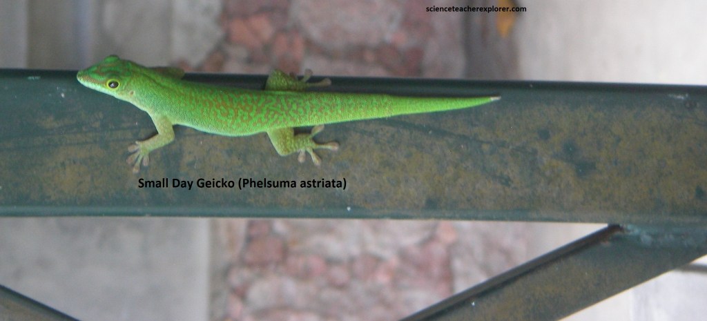 The Vallee de Mai has a surprisingly high representation of endemic reptiles. Fairly fast rooming around being part of the remarkable reptile world in the forest are the Day Geckos, the Bronze Geckos, the Seychelles Skink, two types of Snakes, two types of Chameleons and two types of Frogs. Pictured above is the Seychelles Small Day Gecko (Phelsuma astriata) with a white belly and green or yellow-green eyering. The dorsal side had irregular red markings, usually including a red chevron or angel on the head and two narrow transverse red bars on the neck with scattered red spots on the back.
