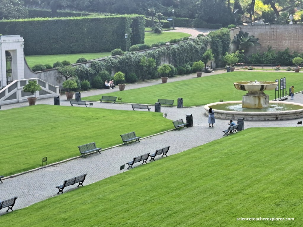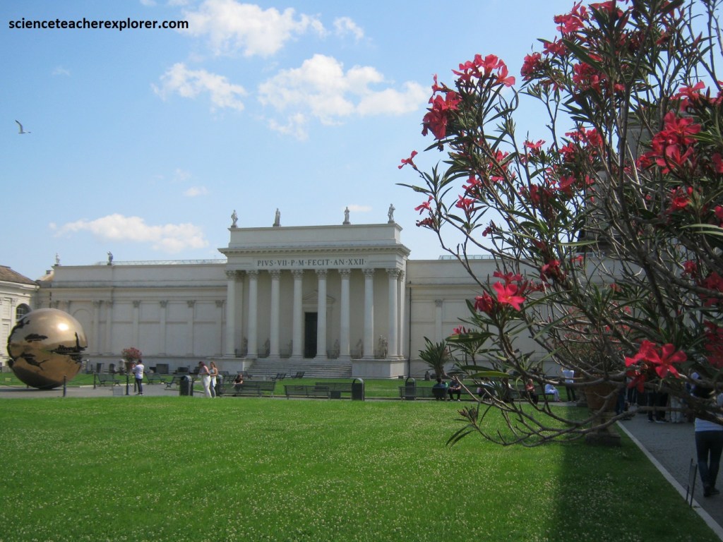 Imaged above, the Vatican museums are 14km long and there are about 2,000 rooms in the museum. Becky and I started, by the ‘Vatican Gardens’, (pictured below). This was in front of the Academy of the Sciences. This was originally Caligula’s Circus, which was later enlarged by Nero. Nero reigned from 54-68AD and during his reign there was a great fire in 64AD. So Nero blamed the Christians, which was considered a new strange sect and told them that the Roman Gods were angry at them for worshiping only one God. Saint Peter died during this persecution.