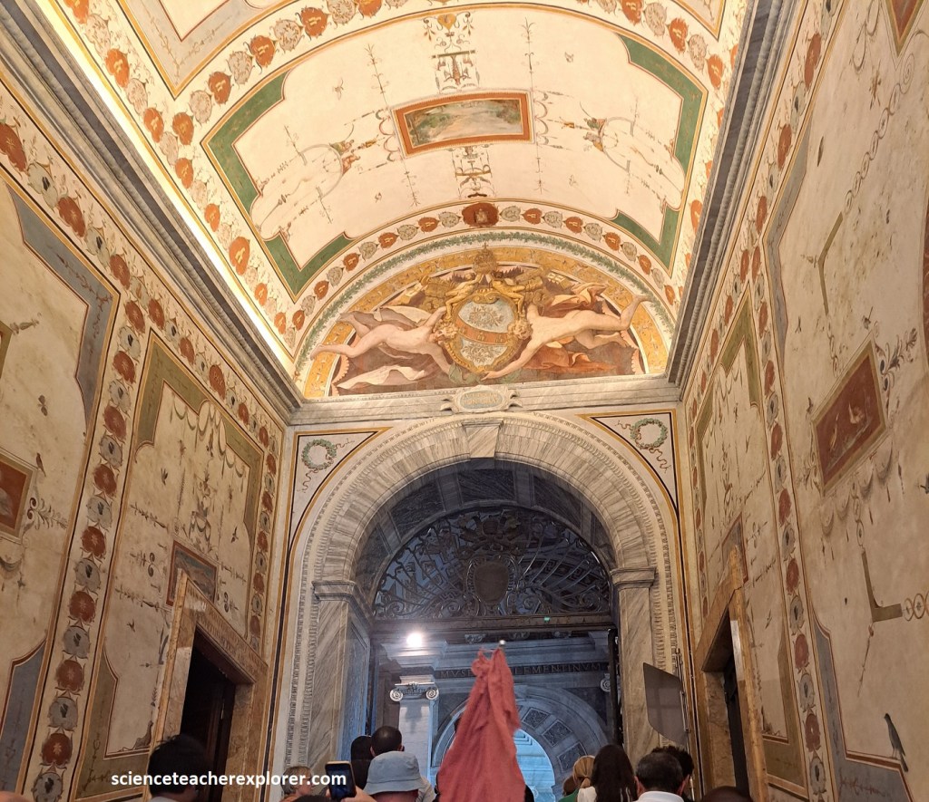 When Becky and I crossed the courtyard and entered the museums on the other side, we saw a huge collection of ancient busts and statures on the right. These busts were probably of emperors, senators and gods. When we walked up the stairs to the left of the entrance, we couldn’t help notice the frescos painted on the wall. This style became popular at the end of the 15th century. [Around this time, some strange caves were discovered in Rome, decorated with beautiful frescos that happened to be Emperor Nero’s golden house]. The Frescos next to the stairs became a style known as “Grotesque”, from the Italian grotto for the cave.