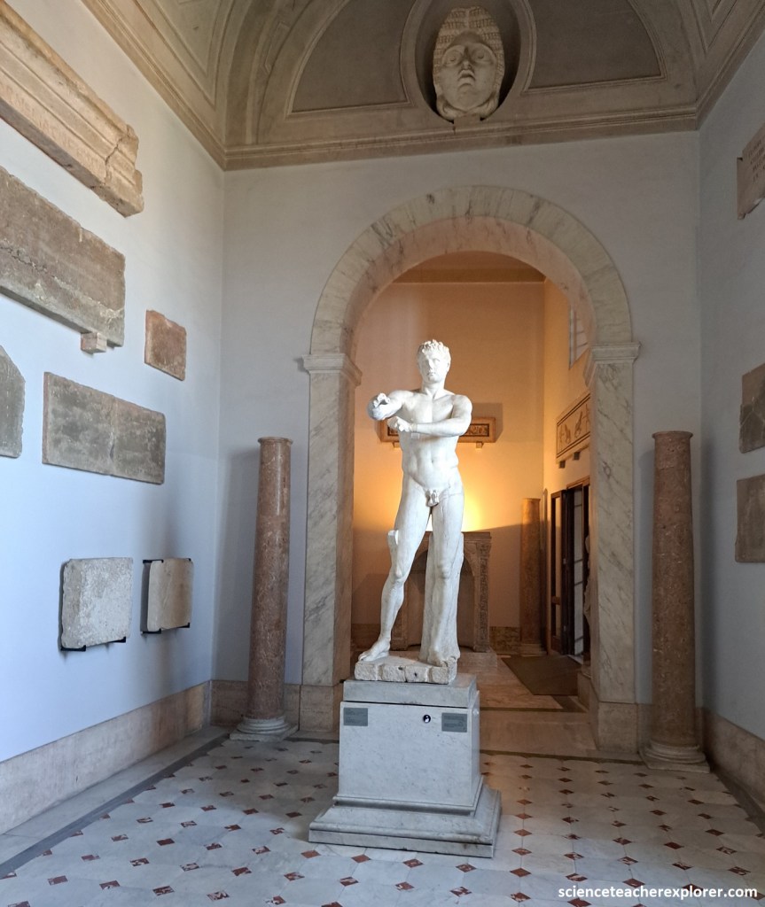 Pictured above, at the end of the hall for the viewpoint is the stature of ‘Apoxyomenos’. It is a roman copy of a very famous lost statue by the Greek sculptor Lysippos. This artist worked at the court of Alexander the Great. In ancient time, wrestlers would often put oil all over their body as a form of protection and to make them slippery. This statue is depicting an athlete that is using an artifact to scrape off the oil and sweat from his body. Romans use this method in the bath-house to clean themselves before bathing.