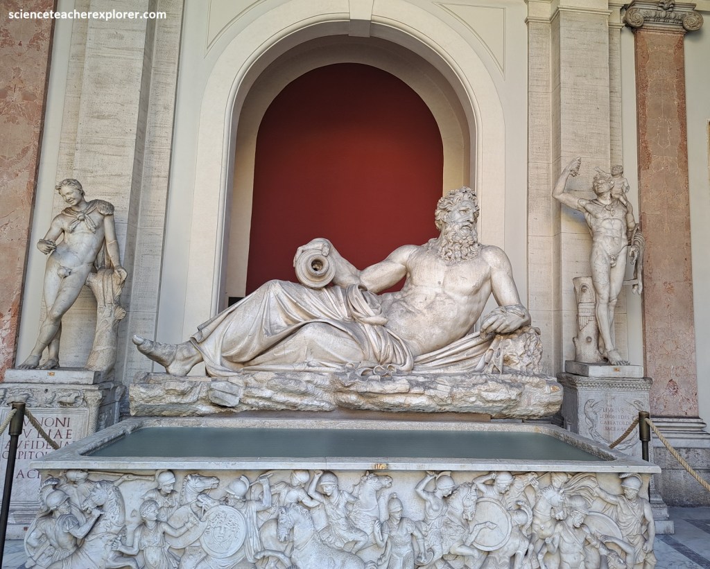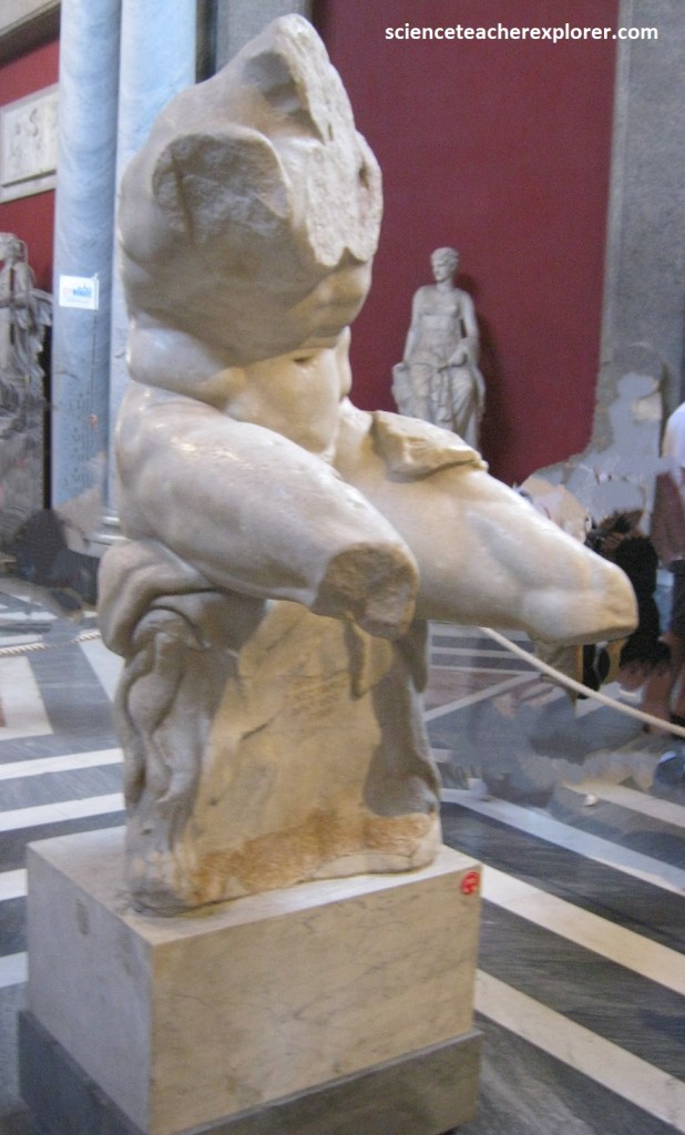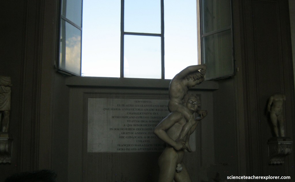 Pictured above, the statue in the middle is very important and is called the ‘Belvedere Torso’. We do not know who it represents, but this torso was of an immense influence on the art of Michelangelo. It was an original Greek statue as we could see by the inscription on the front. It was signed with the name “Apollonius”. This piece was found in the 15th century at the site of the Roman baths of Caracalla near the Circus Maximus. It was believed to be Hercules, because of the Lion skin he was sitting on.