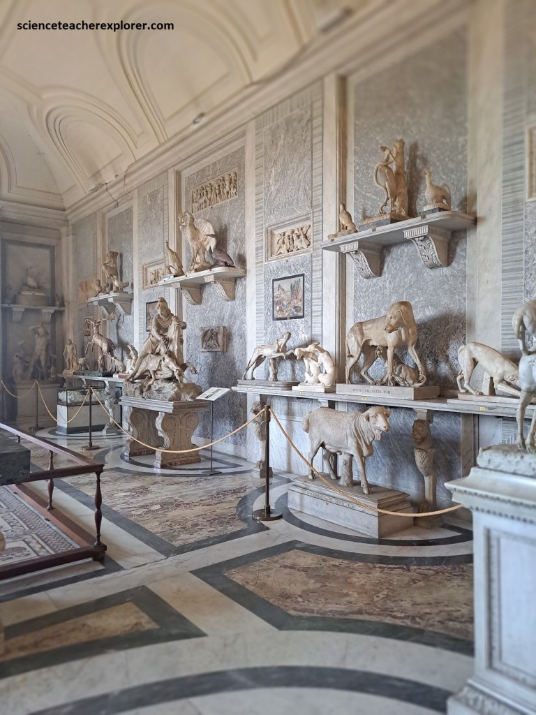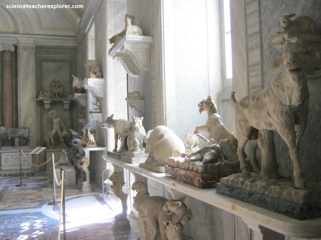 As we continued down the way, on our right, we saw a room called the ‘Room of the Animals’. We could see may beautiful statues of animals. They were all ancient, but often heavily restored in the 19th century. Apparently, the romans really like these kinds of statues. The really liked representations of day to day life in their homes.