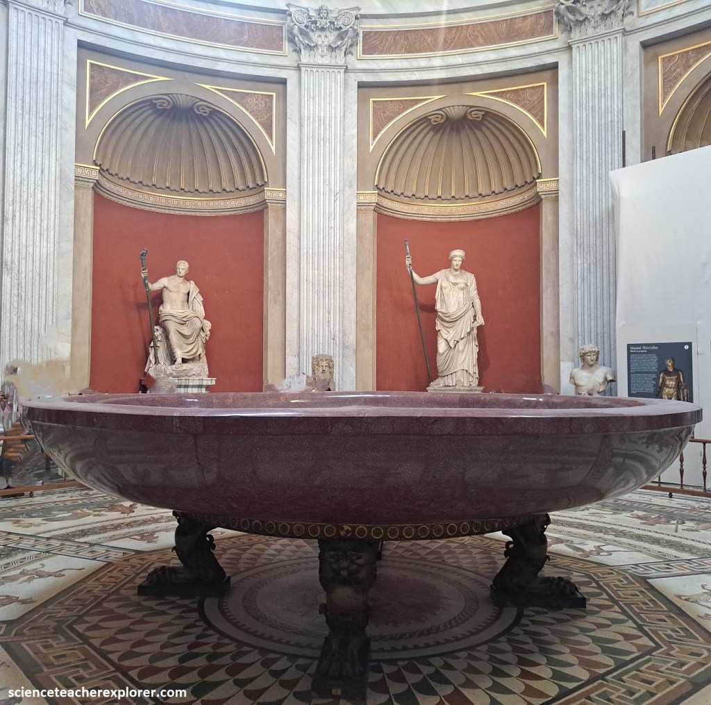 Pictured above, the center of the ‘Round Room’ stands a monolithic basin. It is made out of one piece of ‘red porphyry’ that comes from the time of Emperor Nero. This bath stood in Nero’s enormous golden house. ‘Red Porphyry’ was known as the Emperors marble, because purple was the color of the Emperors and the rock at that time could only be found in a remote place in Egypt. Additionally, the mosaic floors in this room date back to the second century BC and depicts the battle of the Centaurs. This mosaic came from bathhouse in Ostia, (the old port of Rome).