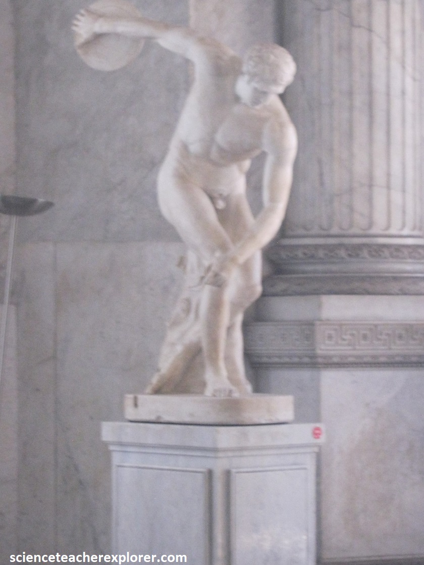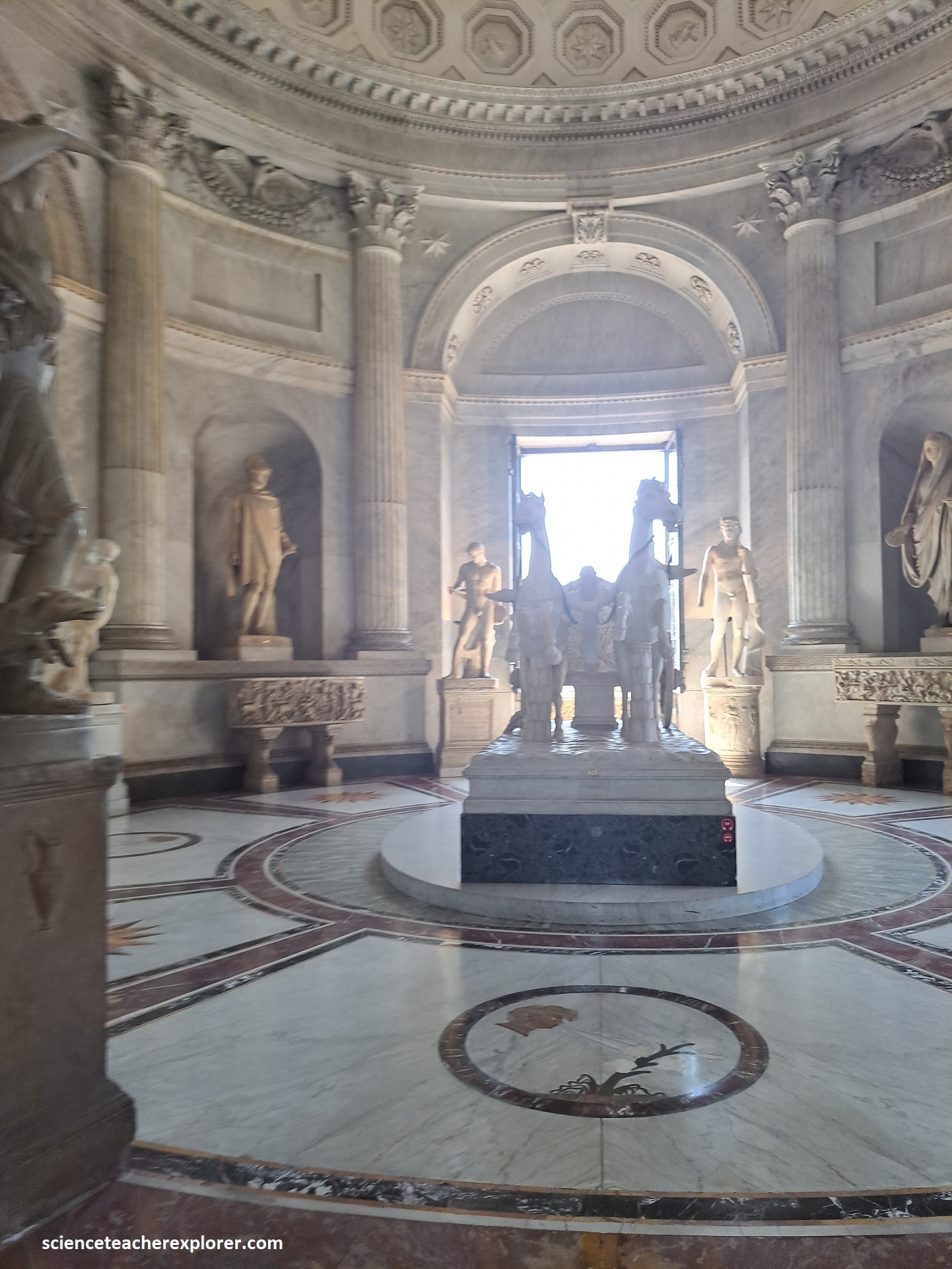 When Becky and I moved out of the ‘Room of the Greek Cross’ and the stairs, we came across a small room that houses a few very beautiful roman statues, (pictured above). Statues and sarcophagi depicted scenes from athletic competitions and circus games. We could see athletes throwing discus, wrestling, and competing in chariot races. The antique works were positioned around a beautiful marble chariot which stood in the middle.