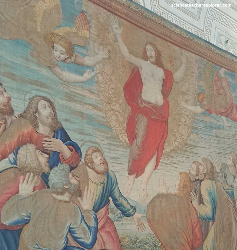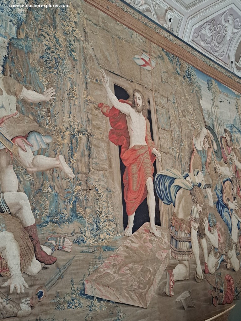 Pictured above, the next tapestry represented the resurrection of the Christ. After the Romans crucified Jesus, he was anointed and buried in a new tomb by joseph of Arimathea. God raised him from the dead after 3 days and he appeared to many people over a span of 40 days before he ascended into heaven. This was the most famous tapestry.