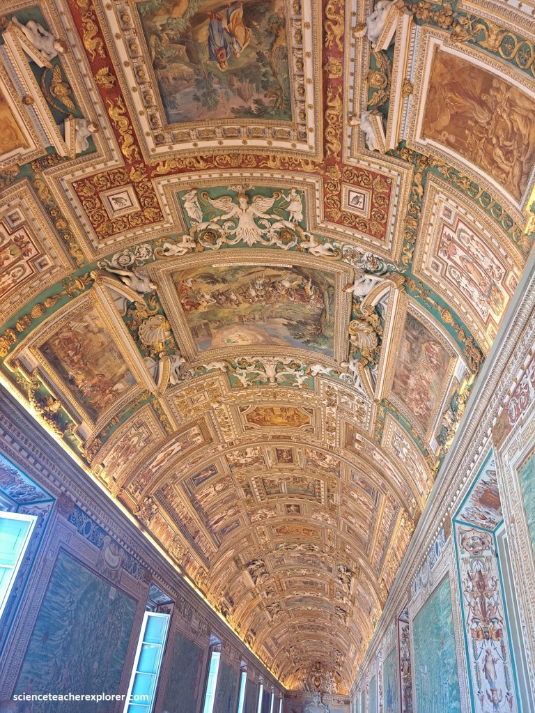 The next gallery was called the ‘Gallery of the Maps’. It was 120m long. There are 40 maps in this room. It seemed like the maps on the left of us represented the west side of Italy and all the maps on our right represented the east of Italy. Pictured above, the ceiling was breathtaking. We saw 80 episodes from the history of the Catholic Church and the lives of the Saints. All the stories that were painted took place in the territory of the maps beneath them. The maps were painted and designed by the most famous cartographers of the late 1500s, who were led by Ignazio Danti, a Dominican monk. This was an amazing achievement because they did not have modern technology like aerial photography and satellites at that time.