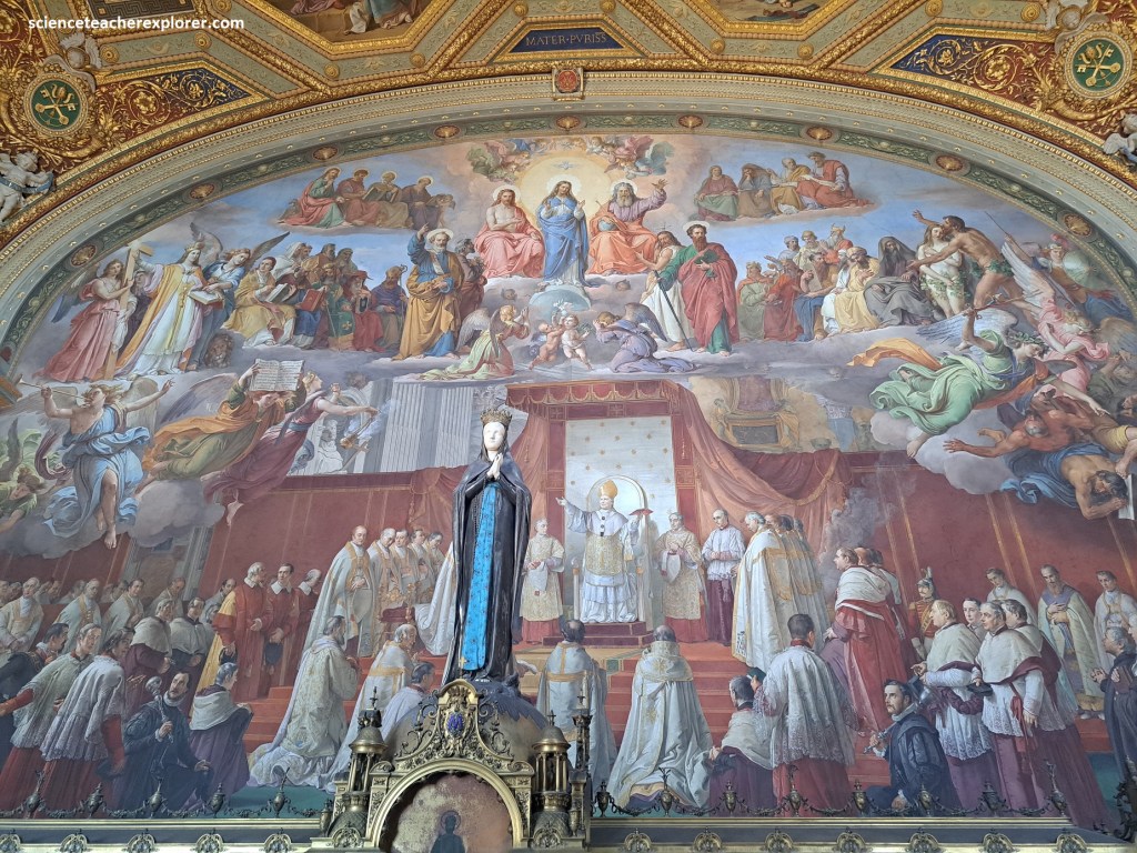 In the next room, from the ‘Gallery of the Maps’ was a crossroad-room. We had to decide to go had to decide to go straight ahead and go directly to the Sistine Chapel or we could go left and visit Raphael’s rooms. We chose the Sistine Chapel. On the way, we crossed through a room called the ‘Room of the Immaculate Conception’, (pictured above). The Frescos here were painted by Francesco Podesti in the 19th century. They showed scenes from the proclamation of the Dogma of the Immaculate Conception by Pope Pius IX in 1854. [According to the doctrine, Anne’s womb was without sin and so the Virgin Mary was born free of original sin and therefore Christ was born free of sin].