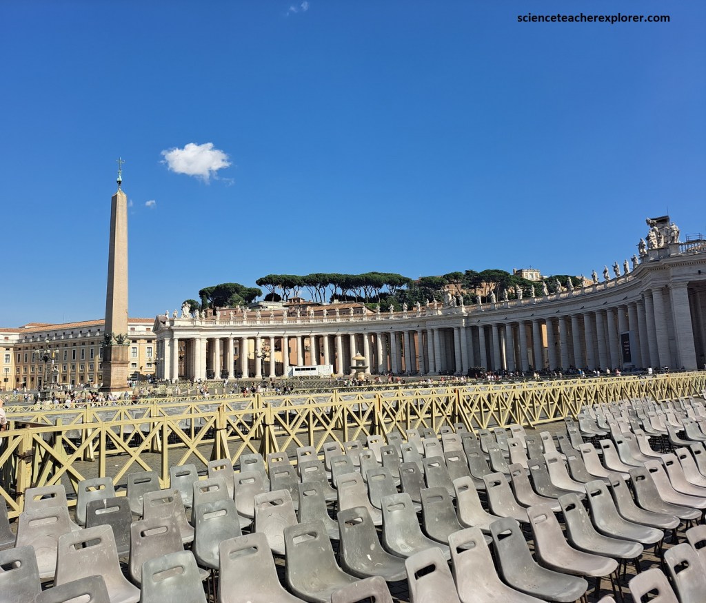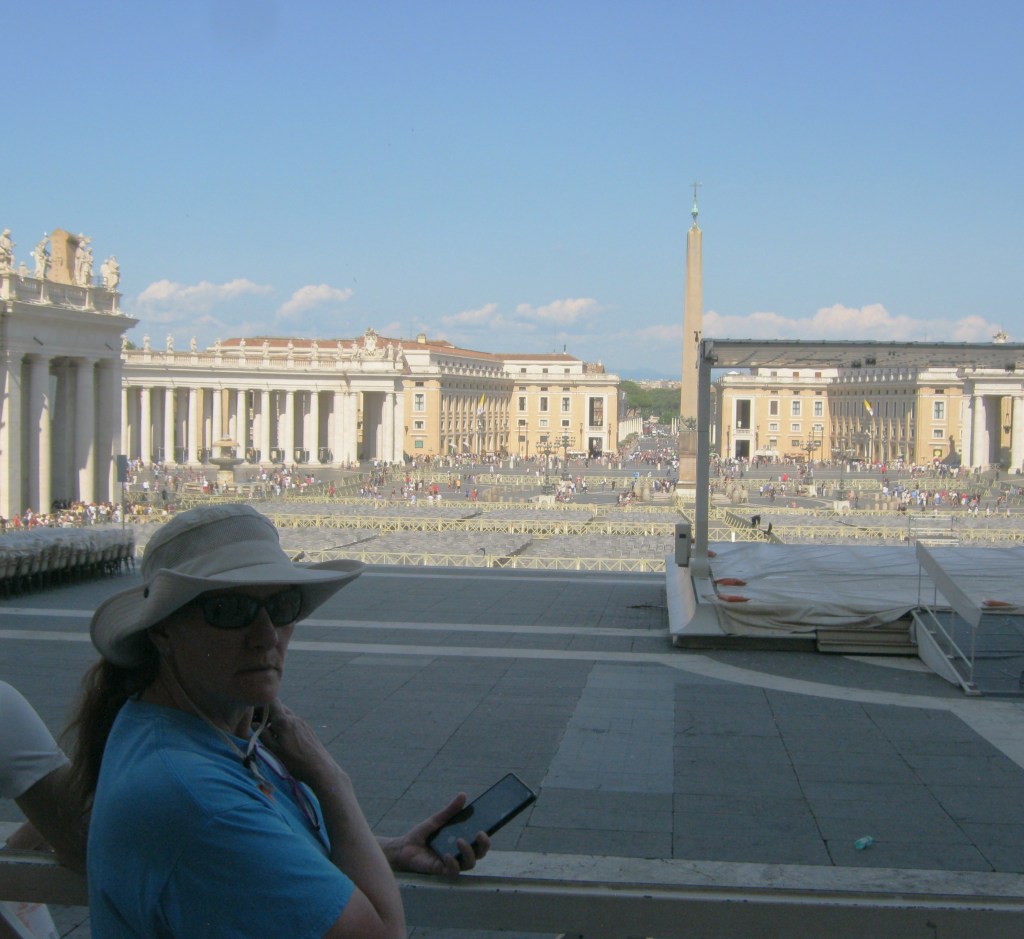 When Becky and I left the Sistine Chapel, we came out onto the Atrium of St. Peter’s Basilica. Imaged above, Bernini created the St. Peter’s Square which symbolizes the arms of the Vatican, which welcomes you as you enter the square from the east, (the two colonnades represent arms for the church).