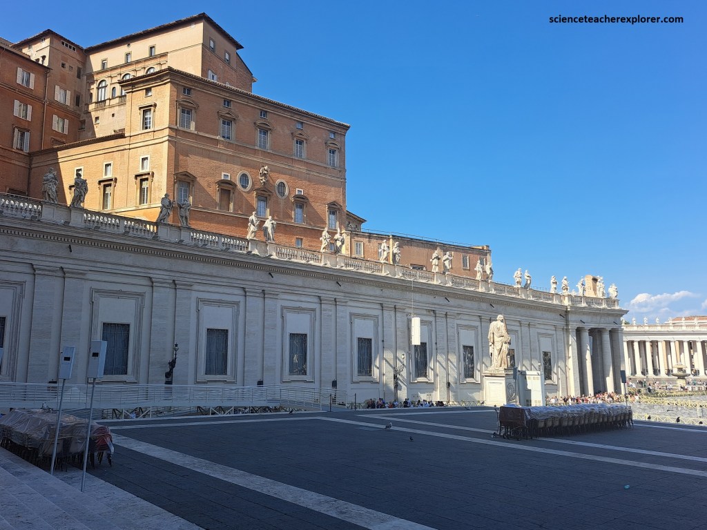 Pictured above, the Papal Palaces that we could see towering above St. Peter’s Square wee built in the late 1500s. Inside, there are 1400 rooms, 20 courtyards, and Olympic-sized swimming-pool, a bowling alley and a movie theater.