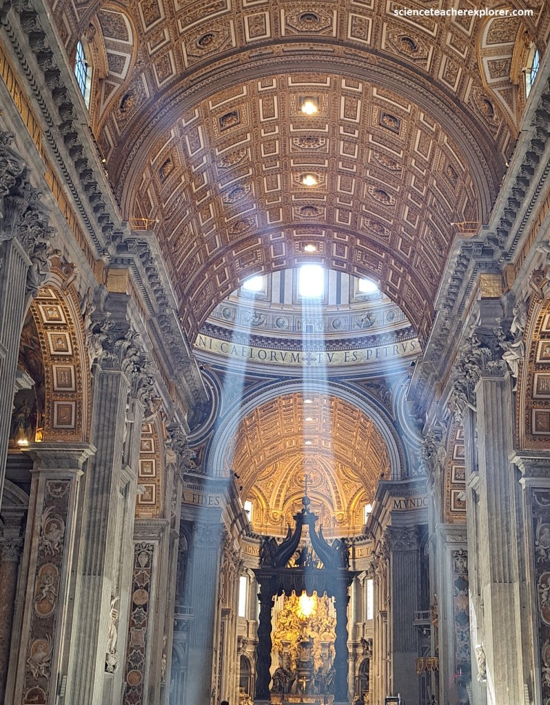 Pictured above, the nave of St. Peter’s Basilica gave us a sense of the splendor of ancient Rome that was carried on by the Catholic Church. The floor plan, (with a large central aisle or nave flanked by 2 side aisles), is based on the ancient Roman basilica or law-court building. The ornate, Baroque-style interior decoration, (a riot of marble, gold, stucco, mosaics, columns of stone, and pillars of light), was part of the Church’s ‘Counter’ Reformation. Baroque served as cheery propaganda impressing followers with the authority of the Church, and giving them a glimpse of the heaven that awaited the faithful.