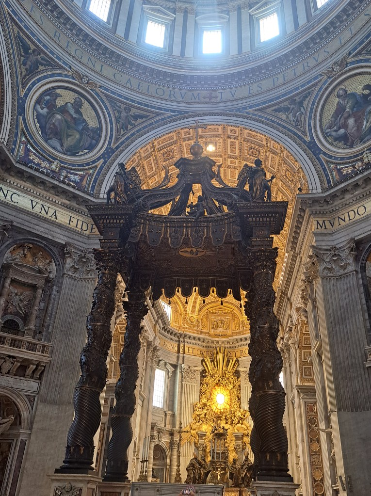 Pictured above, the ‘Baldacehino’ is the 4-legged structure above the Papal altar in Saint Peter’s Basilica. One of the most important decorations, (commissioned to Bernini), would be the ornamentations of the Papal altar, above the grave of Saint Peter. It had to be seen through for the ‘Cathedra Petri’ and it had to be made of Bronze, (stolen from the Pantheon’s front porch beams). Therefore, the columns were created from bronze and then ornamented with gold. They were twisted to reference the whipping and suffering of Jesus. Other decorations are laurel leaves and bees. The ‘Baldacchino symbolizes heaven. The monument at the back of the church was also made by Bernini. ‘Cathedra Petri’ is Latin for the Seat of Peter.