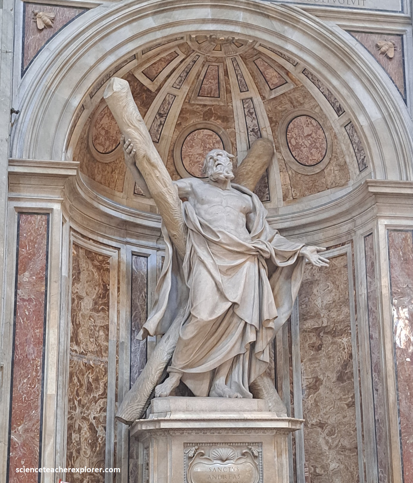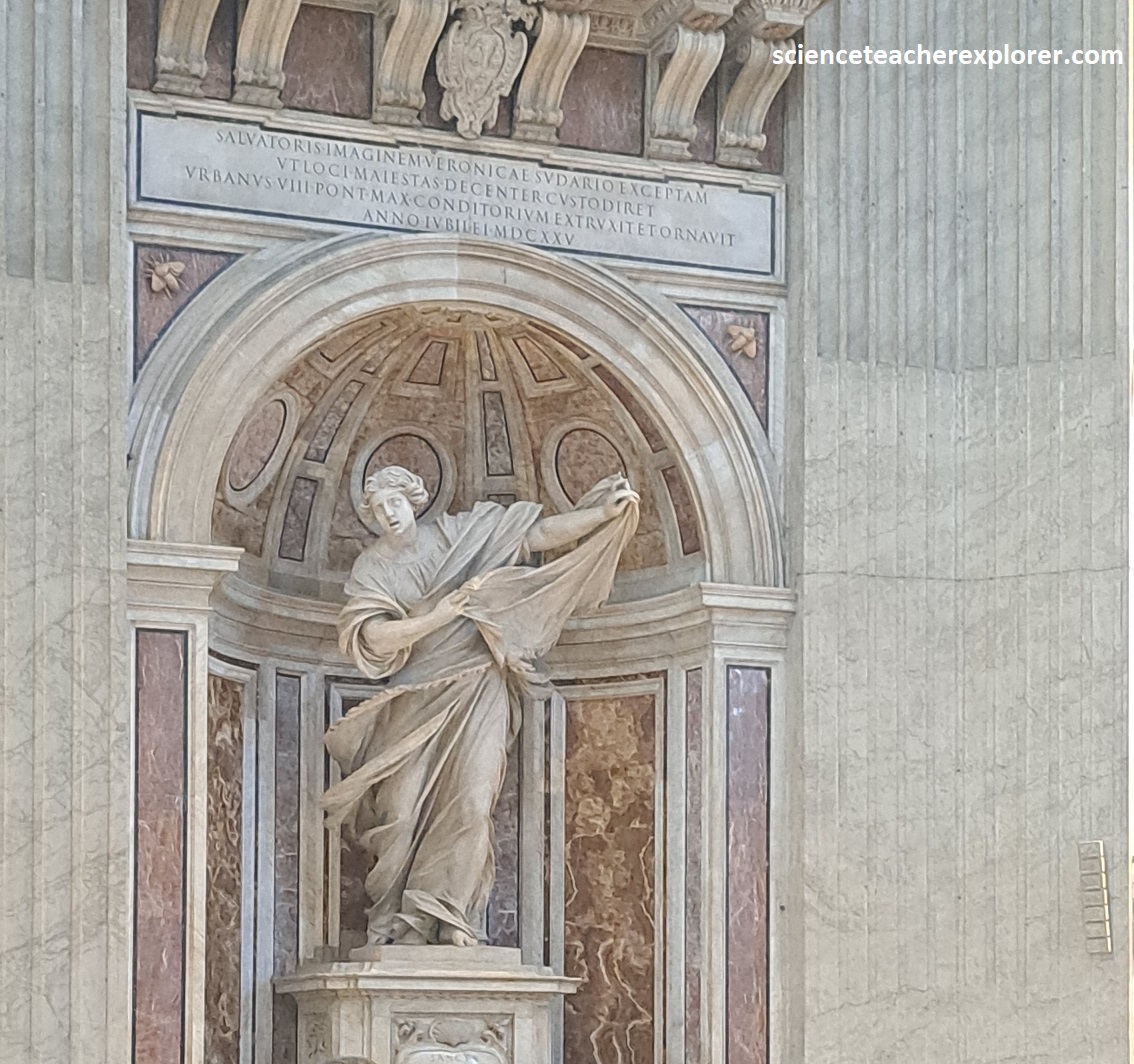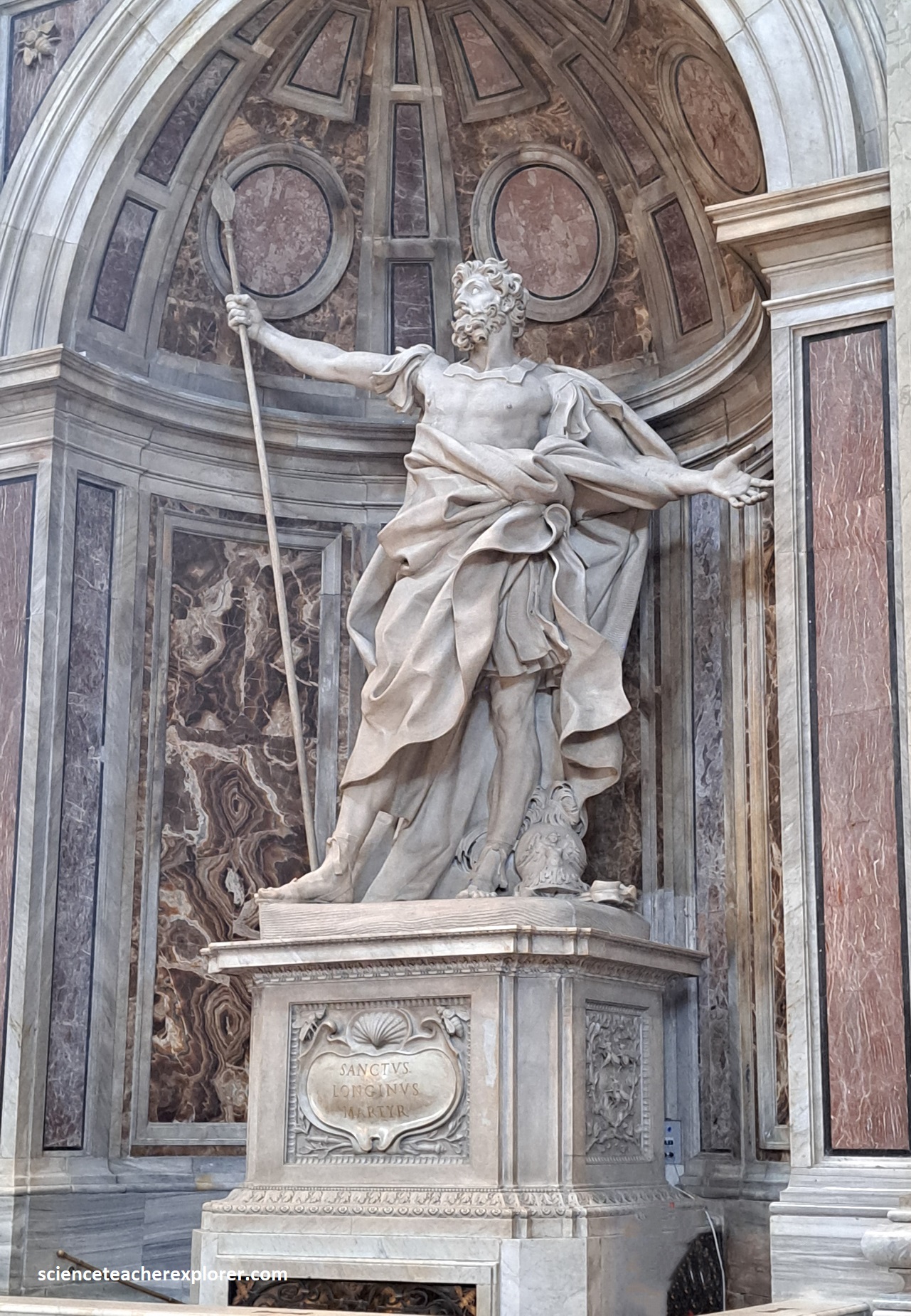 It was decided there should be balconies in the main columns that supported the dome of Saint Peter’s Basilica. Inside these columns, some of the most important relics of the church were kept to show the people. Bernini designed the balconies and the bas-reliefs above them. Under the balconies, (pictured above), Bernini made space for 4 important statues, one of Saint Andrew (Peter’s brother and patron saint of Scotland & Greece), one of Saint Veronica (she saw Christ fall for the 3rd time when he was carrying his cross up the hill and stepped forward to wipe his face with her veil), one of Saint Helen (Emperor Constantine’s mother, who brought the cross back from Jerusalem), and one statue of Saint Longinus (the soldier that used his lance to pierce the side of Christ while he was on the cross and later martyred, because he showed mercy to God’s son).