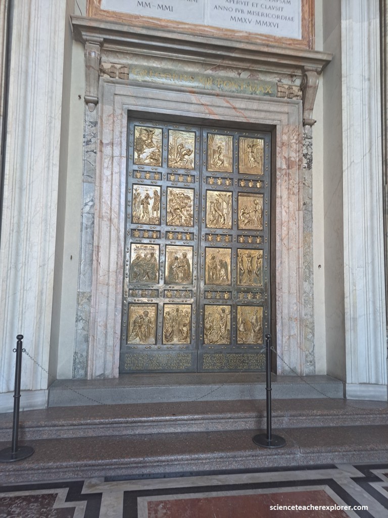 Becky and I decided to move into & explore the St. Peter’s Basilica. Pictured above, the doors on the right are known as the ‘Holy Doors’. They were made of bronze and are closed with bricks on the inside. The ‘Holy Doors’ are opened only every 25 years in a Jubilee year, a Holy year. The next Holy year was supposed to be in 2025, but Pope Francis proclaimed a special Holy year for 2016. This was unusual. The last timed they were opened was in the year 2000 by Pope John Paul II. The opening of the ‘Holy Doors’ always takes place on Christmas Eve. The Pop knocks on the doors with a silver hammer and they open up. He is the first to got through and followed by the rest of the clergy and pilgrims. They symbolize the entrance to heaven and if you pass through your sins are supposedly forgiven.