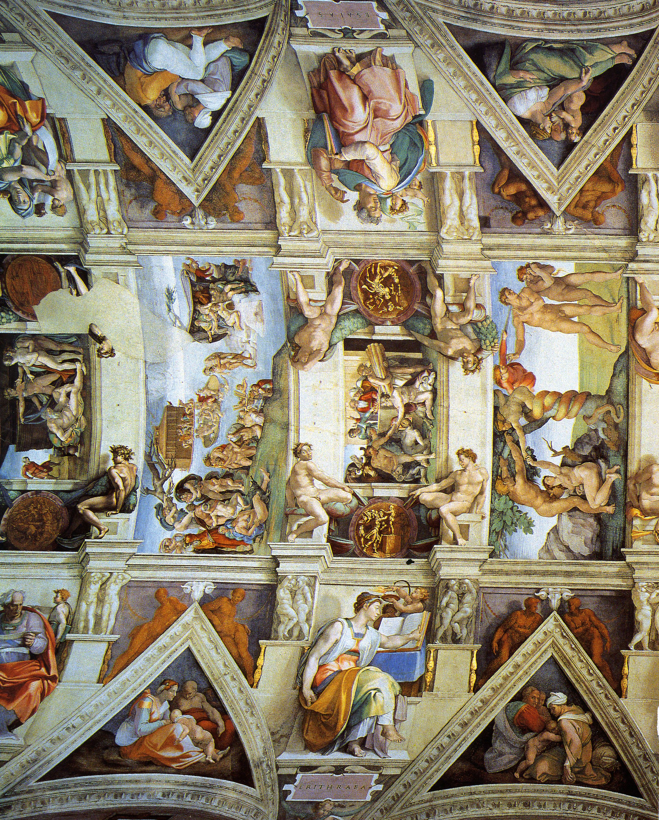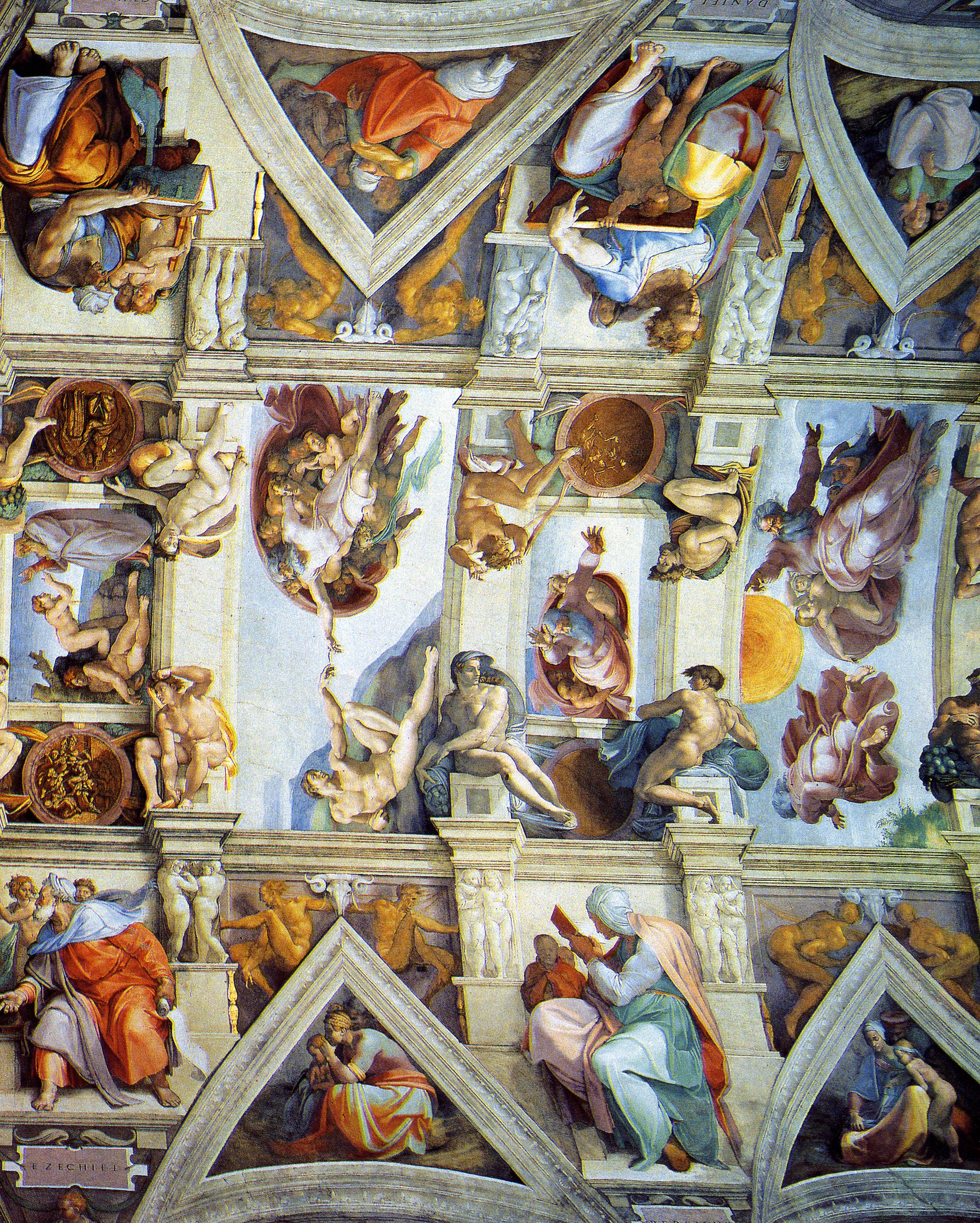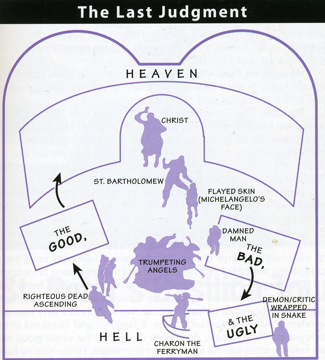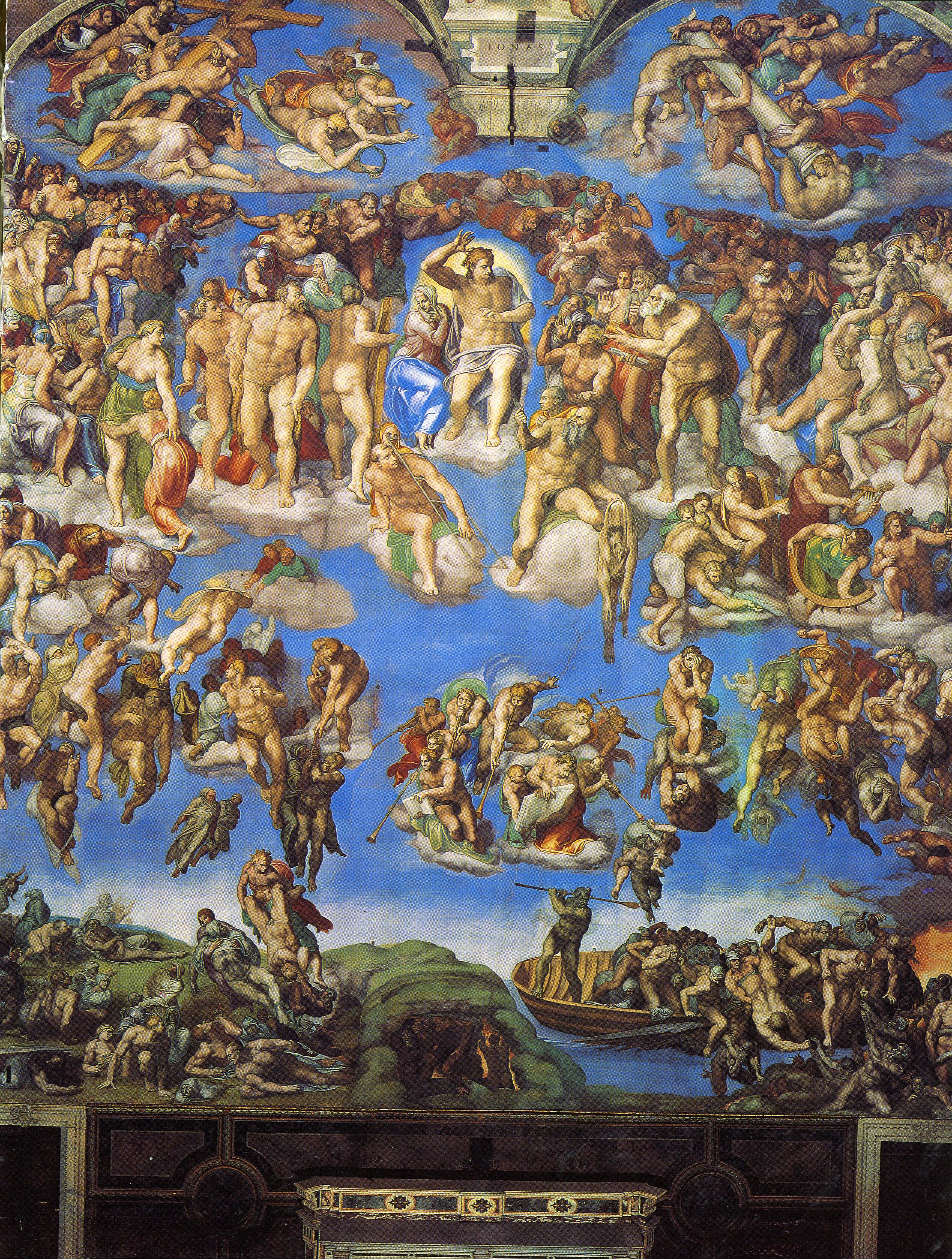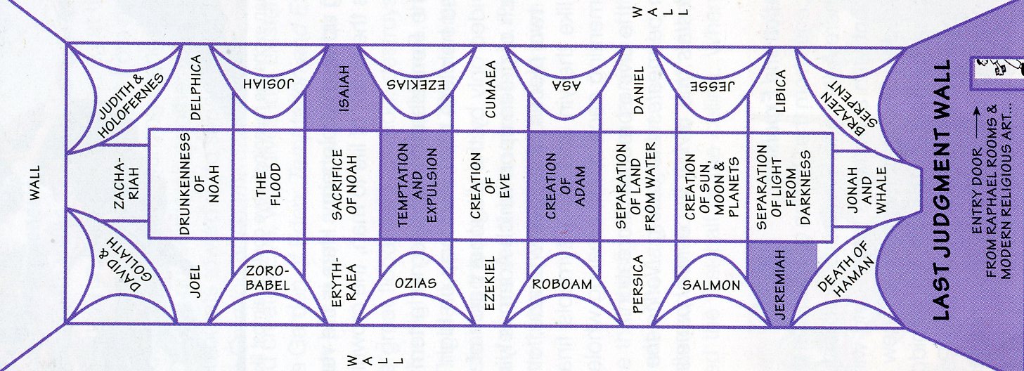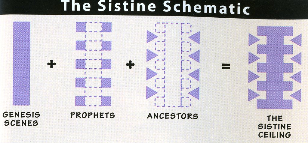 The Sistine Chapel contains Michelangelo’s ceiling and his huge “the Last Judgment”. The Sistine is the personal chapel of the pope and the place where new popes are elected. The ceiling shows the history of the world before the birth of Jesus. We see God creating the world, creating man and woman, destroying the earth by flood, and so on. God himself, in his purple robe, actually appears in the first 5 scenes. Along the sides, we see the Old Testament prophets and pagan Greek prophets and pagan Greek prophetesses who foretold the coming of Christ. Dividing these scenes and figures are fake niches decorated with nude statue-like figures with symbolic meaning. The key is to see 3 simple divisions in the tangle of bodies. Imaged above: (1) the central spine of 9 rectangular biblical scenes; (2) The line of prophets on either side; and (3) The triangles between the prophets showing the ancestors of Christ.
