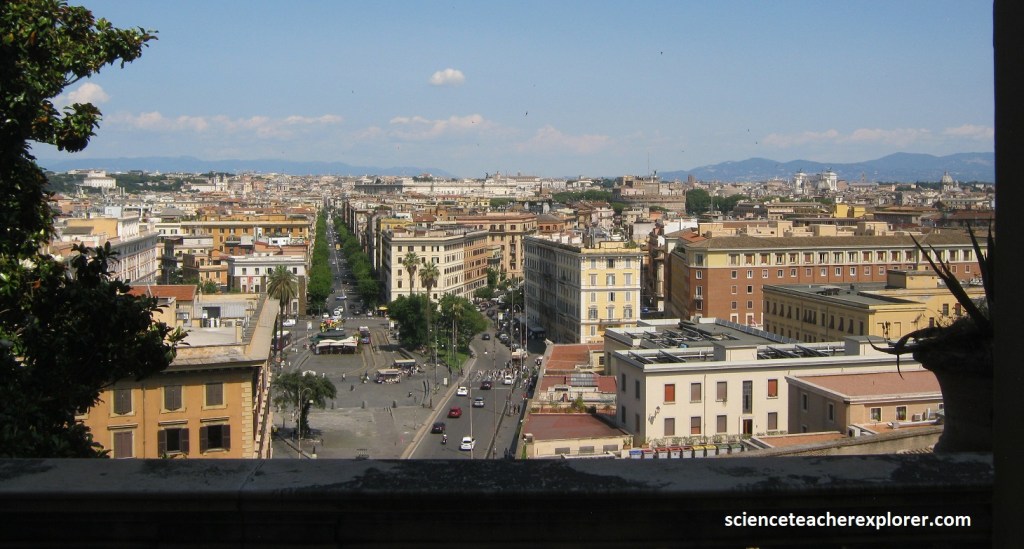Pictured above, on top of the stairs, we could see a nice view of Rome out the window on our right. From here we could see the dome of the Pantheon & the mountains of the Castelli Romani. These mountains are where the summer home, (Castel Gandolfo) of the pope resides. This is also Vatican territory.