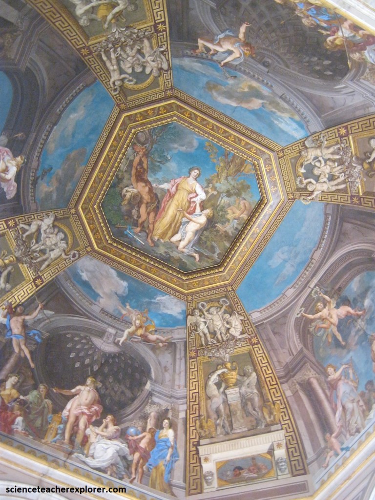 Pictured above, the next room was the ‘Room of the Muses’. We could see the muses standing with their backs to the wall all around the room. They were meant to be seen only from the front. The room was designed by Michelangelo Simonetti and the ceilings were frescoed by Tommaso Conca at the end of the 18th century. [The muses were seven daughters of Jupiter and they represented different arts]. The decoration of the ceiling served as a backdrop to the statues, and depicted Apollo and the Muses inspiring the arts.