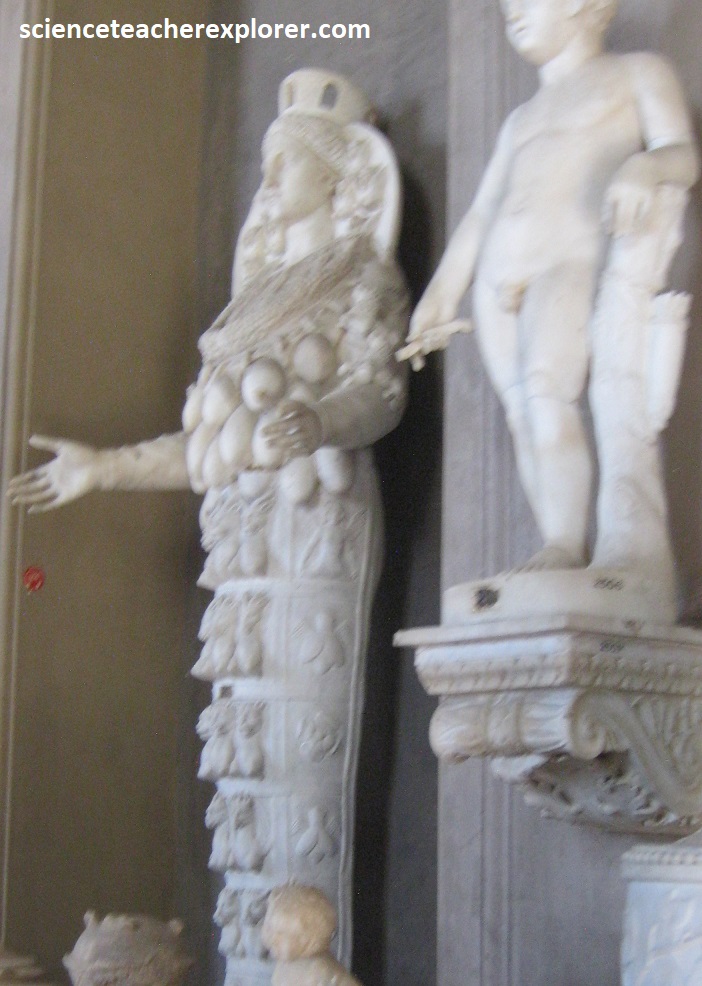 Next was a long-hall, ‘the quarter-mile walk’, that gave us a sense of the grandeur of the former papal palaces, once decorated with statues, urns, marble floors, friezes, tapestries, and stuccoed ceilings. The first room along the long-hall was the Galleria-della-Candelabra, named after the candle holders in the niches. Pictured above, on our right we saw a goddess with what looked like a lot of breasts, (or testicles from bulls). She is Diana, or Artemis in Greek. She is the goddess of hunting and fertility.
