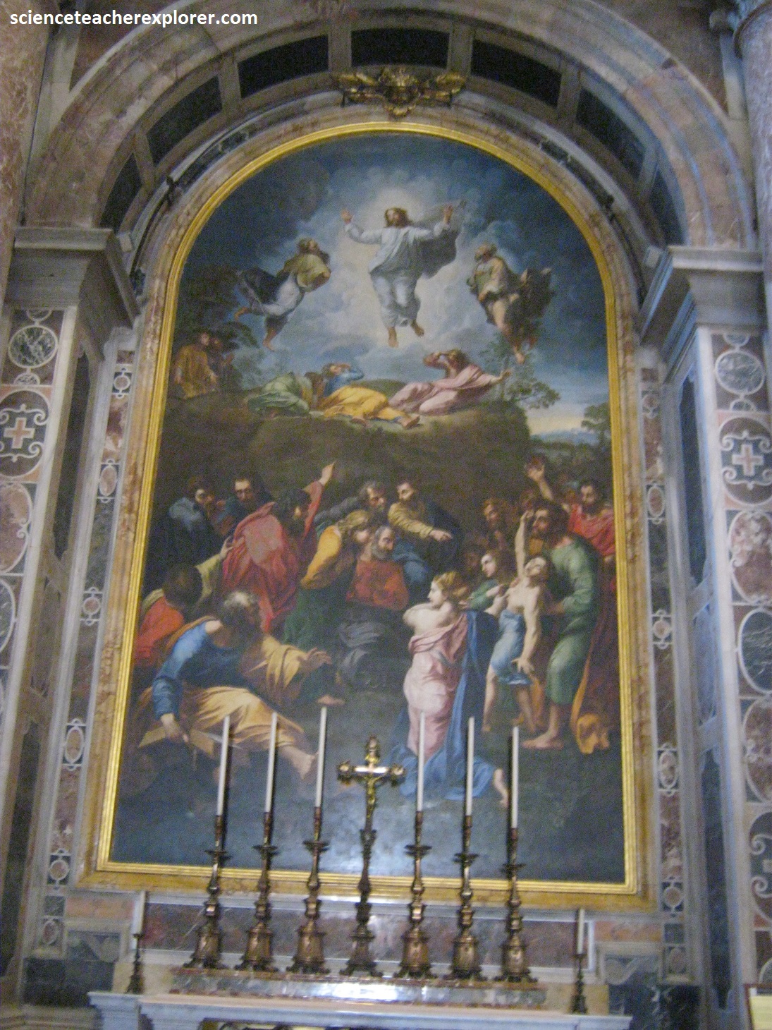 There are a few Popes buried on this level of the church. The other 147 are buried in the crypt, which we visited later. Pictured above on the left was the body of Pope John Paul II (died in 2005), and on the right is Pope John XXIII (died in 1963). [Note the painting of the ‘Transfiguration by Raphael’ (his last work). Here, Jesus starts flying and Elijah and Moses appear next to him in the sky. The apostles, (St. John, St. Peter, and St. James), fall down, blinded by the light.
