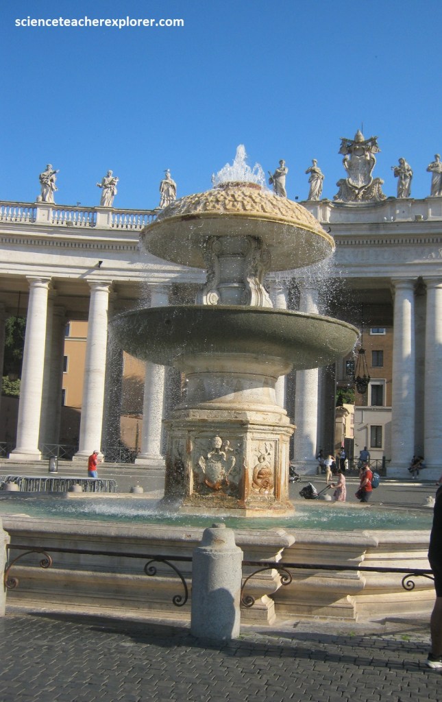 Pictured above, there are 2 fountains on the square, made by Bernini and Maderno. The fountain by Maderno was already there when Bernini designed the square. Bernini created another one for symmetry.