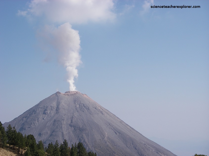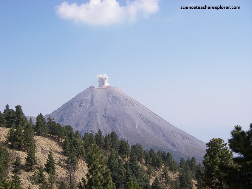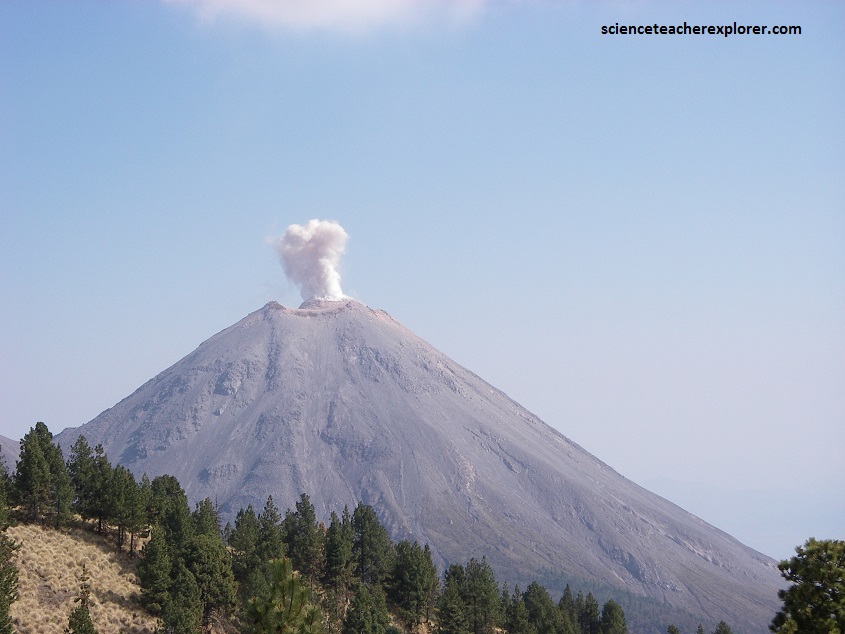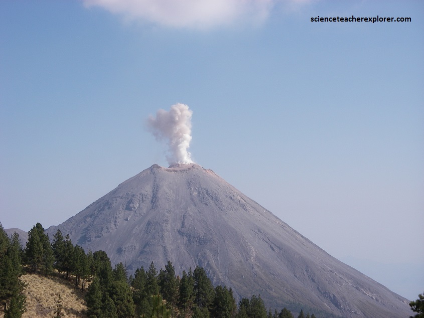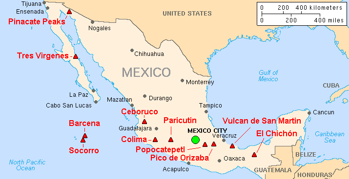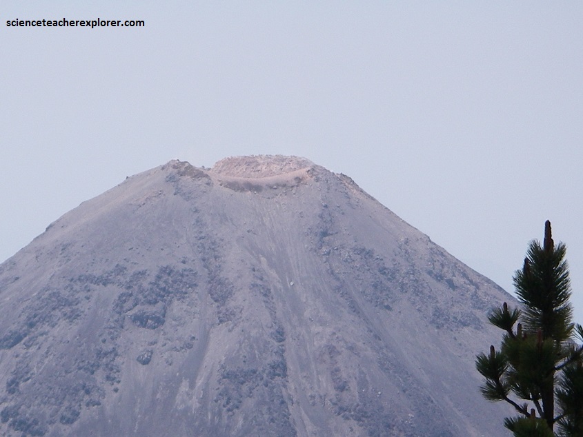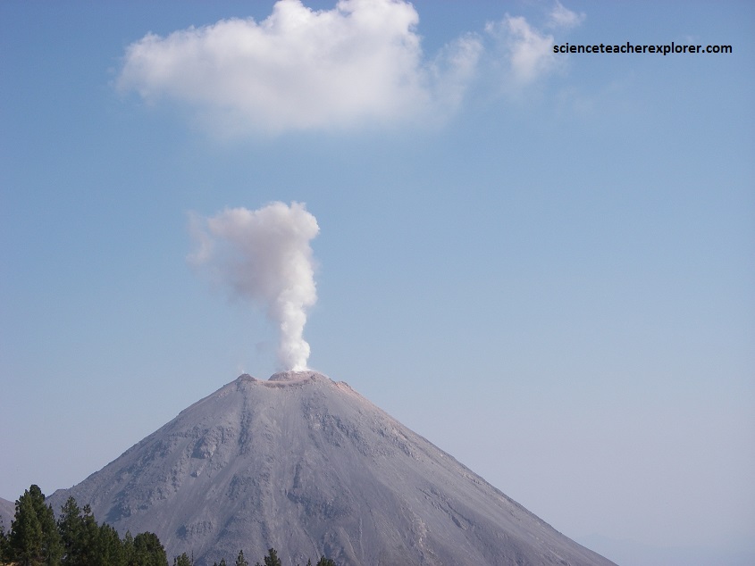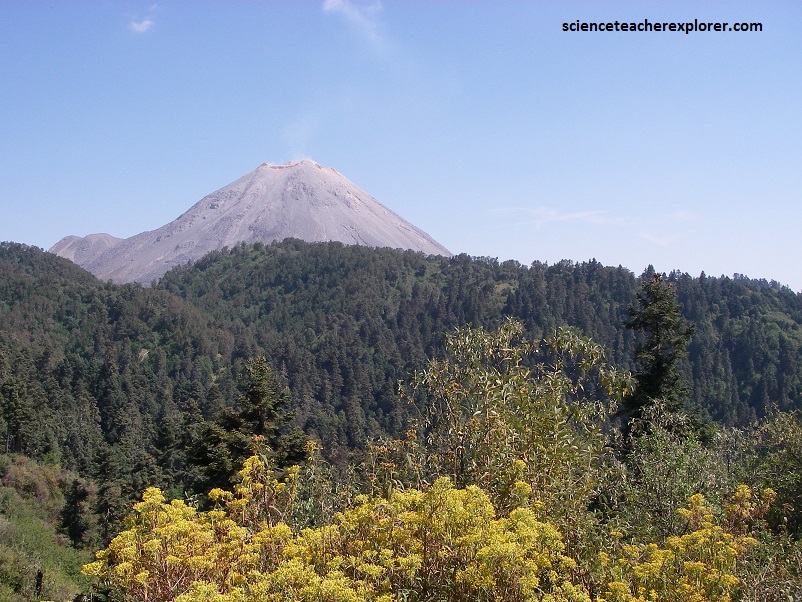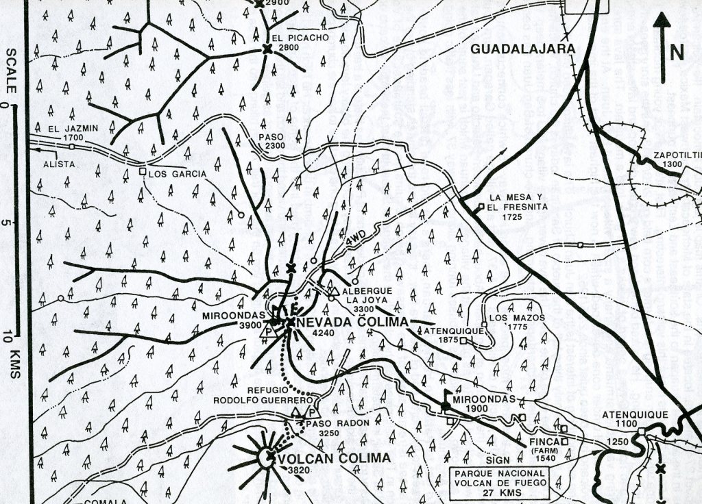 The Volcan de Colima is the most active volcano in Mexico, having erupted violently 40 times over the last 450 years. It is about 485 km west of Mexico City and 125 km southwest of Guadalajara, Jalisco. There are actually two peaks in the volcano complex: Nevado de Colima (4330 m), which is older and inactive, lies about 5 km north of the younger and very active 3860m-tall “Volcan de Colima” (also called Vulcan de Fuego de Colima). Since 1869-1878, a parasitic set of domes, collectively known a, El Volcancito have formed on the northeast flank of the main cone of Colima’s volcano.