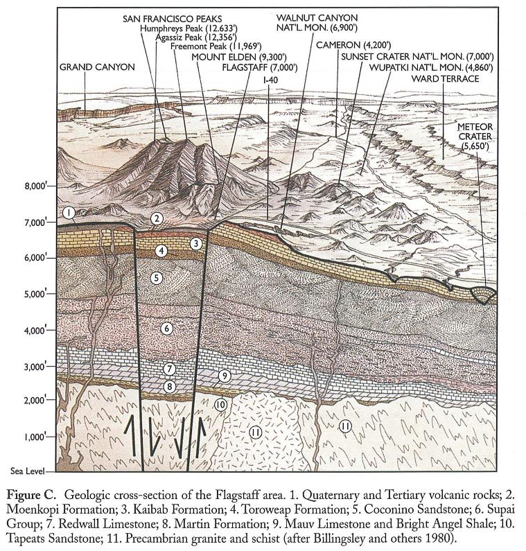 Walnut Canyon lies on the Colorado Plateau and cuts through the Permian-Kiabab Limestone, which exposes the Toroweap Formation and Coconino Sandstone.