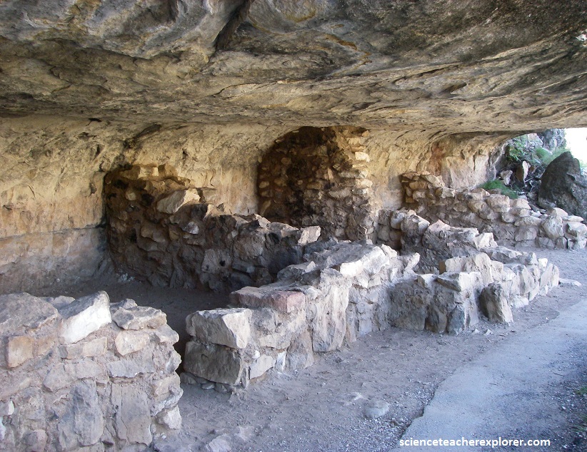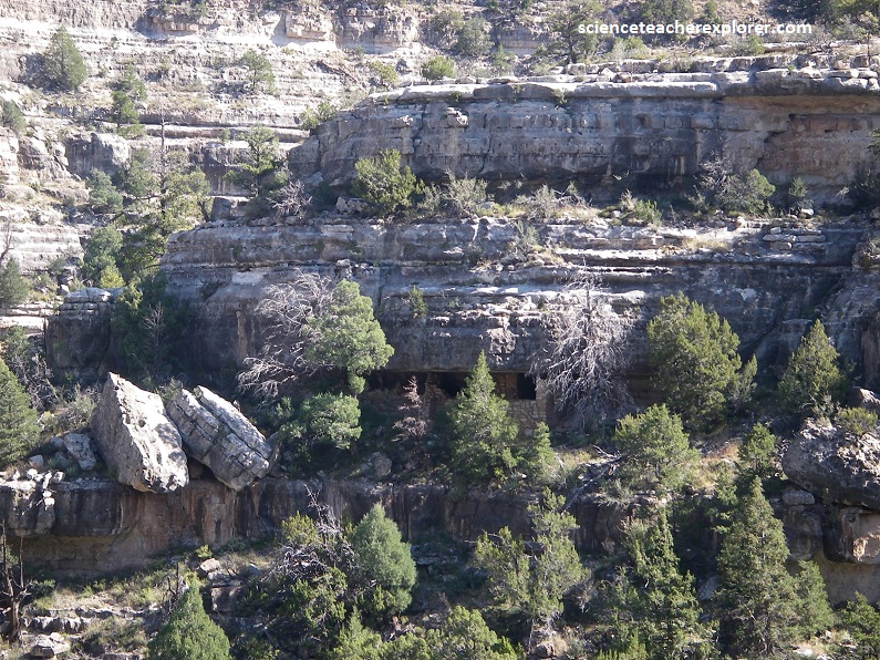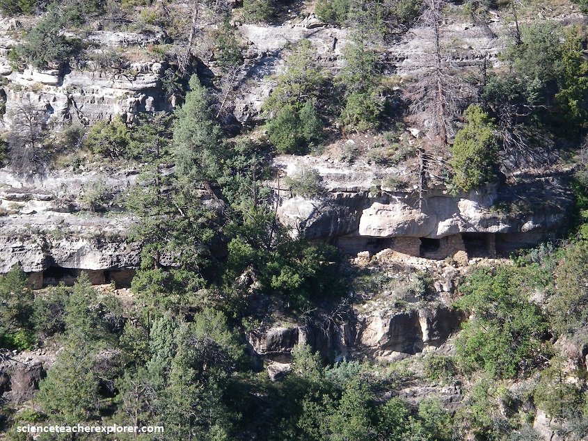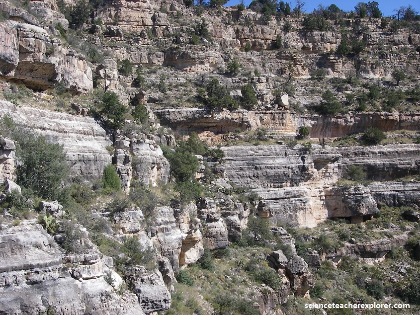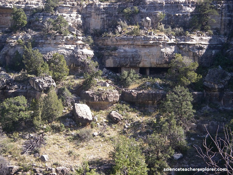 The rocks in the canyon walls are formed of three distinct layers – the upper third of Walnut Canyon’s walls contain Kaibab Limestone that varies in layers and hardness, where the cliff dwellings are found, which overlies steep, scrub covered slopes of the Toroweap Formation, while the lowest third is the sheer-walled, cross-bedded Coconino Sandstone. Many layers of the limestone eroded, creating alcoves that the Sinagua Indians used as cave-dwellings.