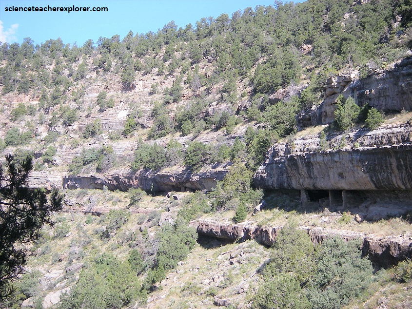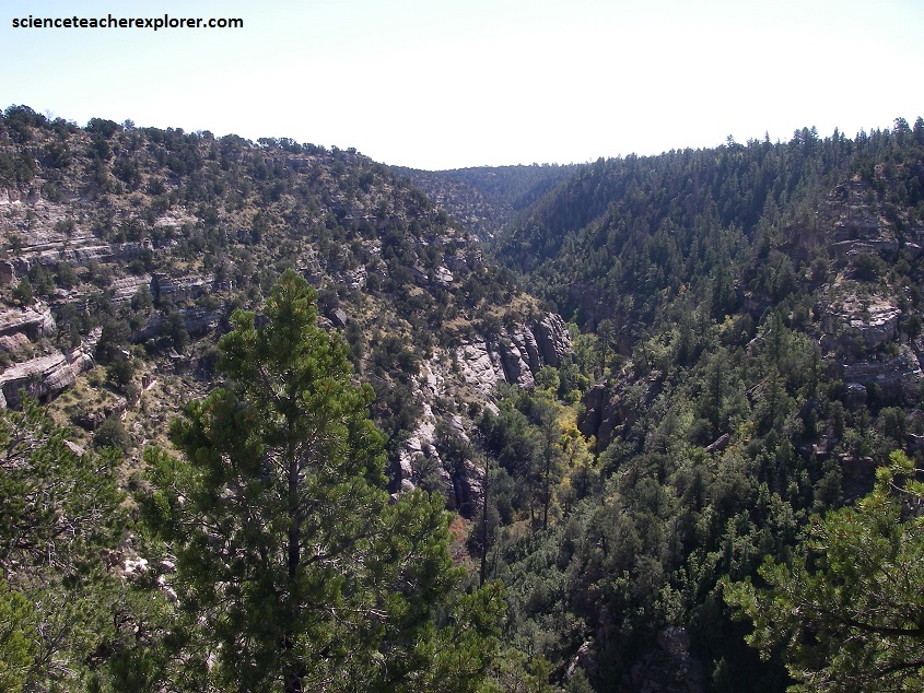 The Walnut Canyon site contains Walnut Creek, which carved a 200 meter deep canyon that flows east. The creek joins into the Little Colorado River en-route to the Grand Canyon.