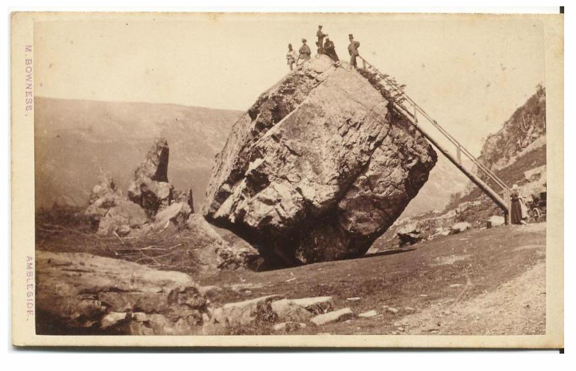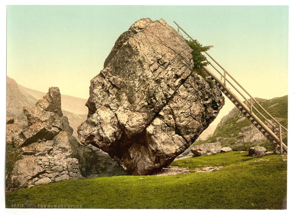 This rock is known as “erratic” because it came from the same source as the glacier and do not normally match local geology. Another plausible explanation is that stone crashed down from Bowder Crag after a massive rockfall at the end of the last glaciation—between 13,500-10,000 years ago. Visitors can climb on top of this huge rock via a metal ladder. It recently replaced a wooden ladder that was installed in the 1860s.