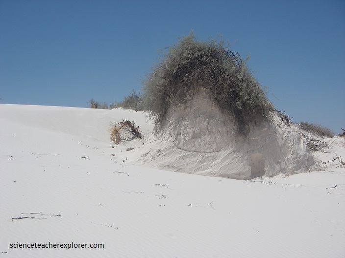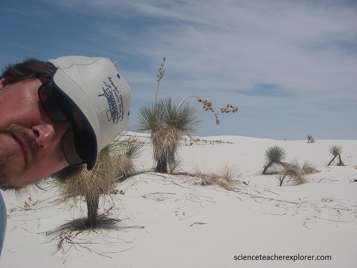 Theoretically 200 cm of water a year evaporates from the lake. The most active dunes can move up to 9 m per year. A few species of plant such as yucca and cottonwood mange to survive on the edges of the shifting dunes. Pictured below, I’m standing on a dune that appears to have a yucca plant growing on it. However, it’s ribbon-like leaves and tiny flowers, instead of bell-like blossoms of the yucca, are the characteristic which make it a member of the lily family. It is the Sotol. The high sugar content of the plant base has value for creating a potent beverage called the “sotol”.