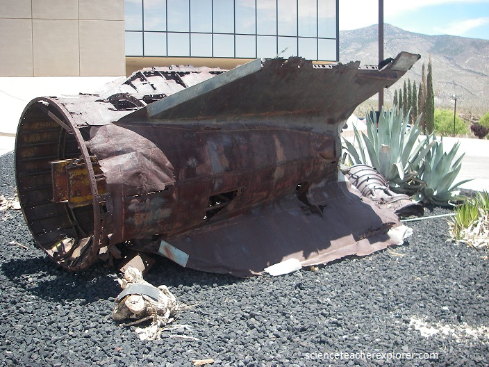 Pictured above, is a remnant of a V-2 rocket. The “Vengeance Weapon-2” (V-2) was the world’s first long-range ballistic missile. The V-2 was used by Nazi Germany near the end of World War II as a terror weapon against London, Antwerp, and other allied targets. After the war, German scientists assisted the U.S. Military in developing the V-2 technology to be used for defense and early space exploration. The components pictured above were used for research, and recovered from the White Sands Missile Range.