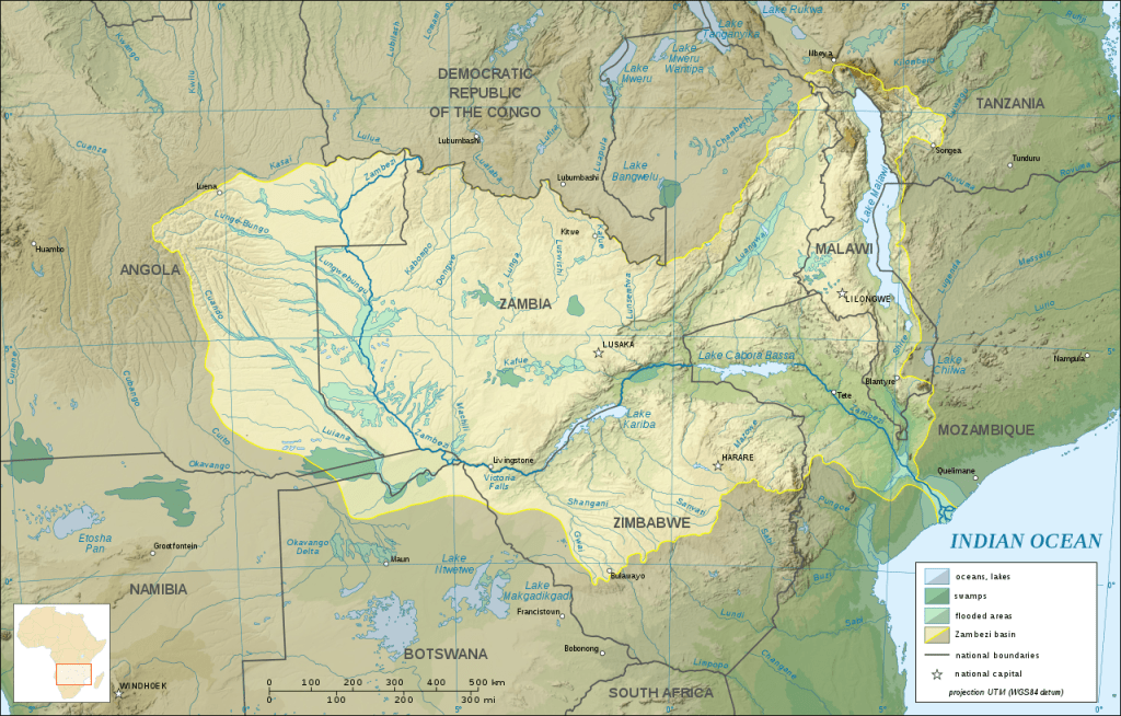The Zambezi River is the 4th longest river in Africa, the longest east-flowing river in Africa and the largest flowing into the Indian Ocean from Africa. Its drainage basin covers 1,390,000 km2 , slightly less than half of the Nile’s. The 2,574-kilometre-long river rises in Zambia and flows through eastern Angola, along the north-eastern border of Namibia and the northern border of Botswana, then along the border between Zambia and Zimbabwe to Mozambique, where it crosses the country to empty into the Indian Ocean.