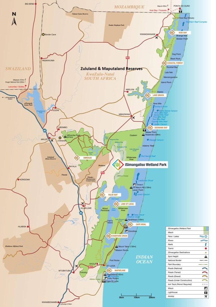 Imaged above, home of the Tsonga and Mabudu peoples, the northeastern corner of KwaZulu-Natal is the most remote part of the province, with large tracts accessible only by four-wheel-drive vehicles. Combined with the total ban on vehicles on the beach and outboard motors at sea, this inaccessibility has protected it from development, and the coastline is absolutely pristine, (however we approached the area on the Pongolapoort Dam/Jozini/Kwangwanase paved road).